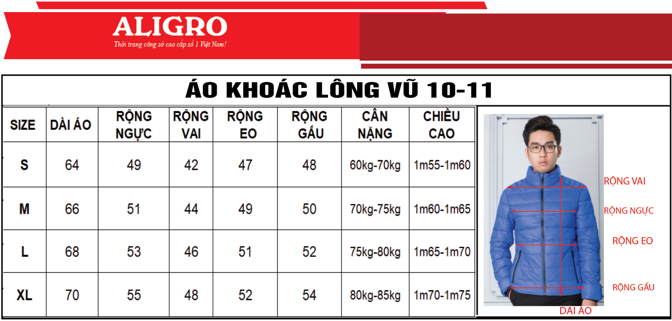 Áo khoác lông vũ Aligro ALGALV.11 màu blue được may từ chất liệu vải Polyester cao cấp, nhẹ và ấm, mang đến cho phái mạnh sự thoải mái tối đa, kiểu dáng trần ngang khỏe khoắn nam tính.