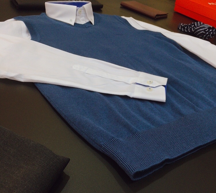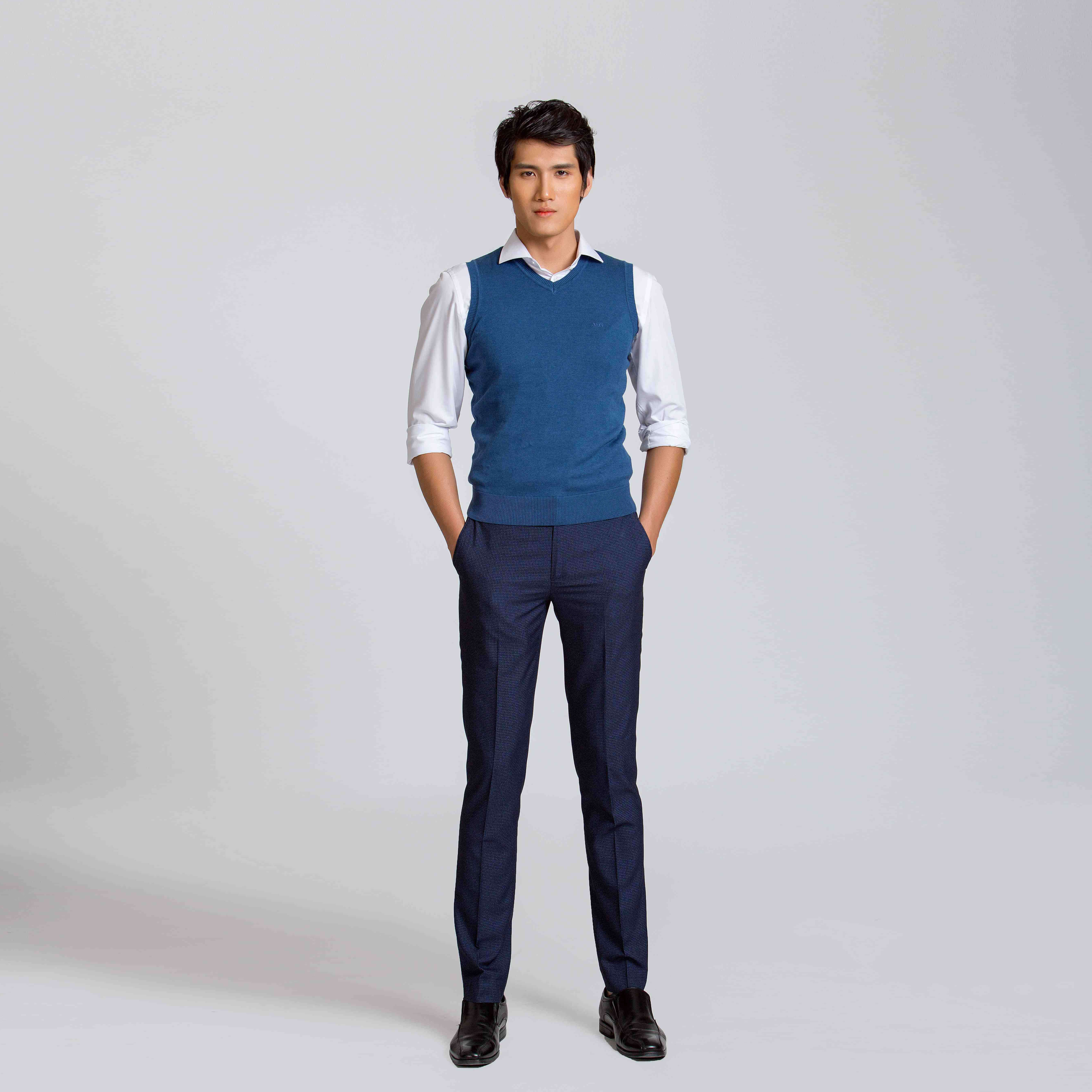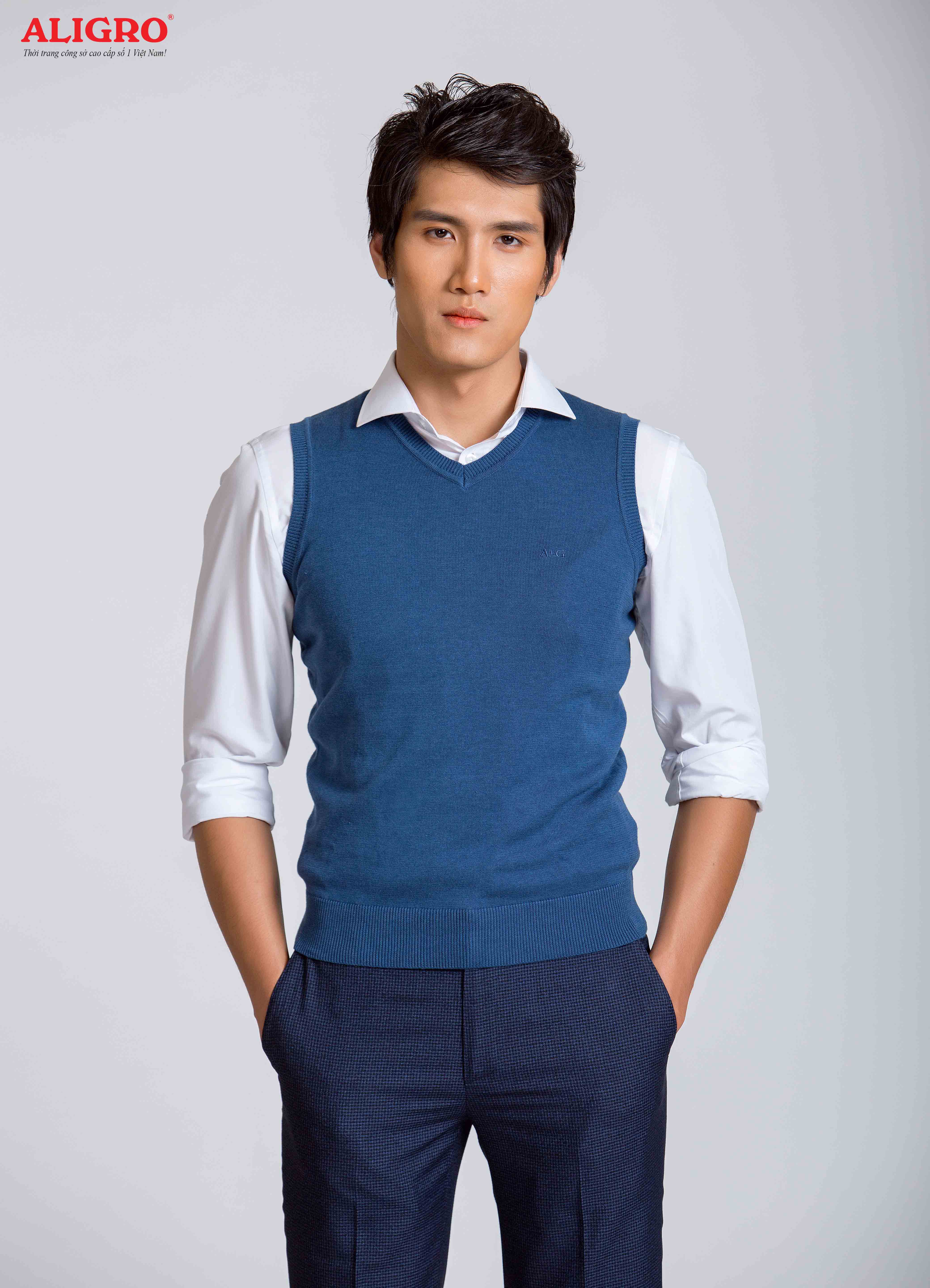 - Áo gilê len cổ tim kết hợp với áo sơ mi dài tay và áo khoác là một sự lựa chọn thú vị cho nam giới trong mùa thu đông này.