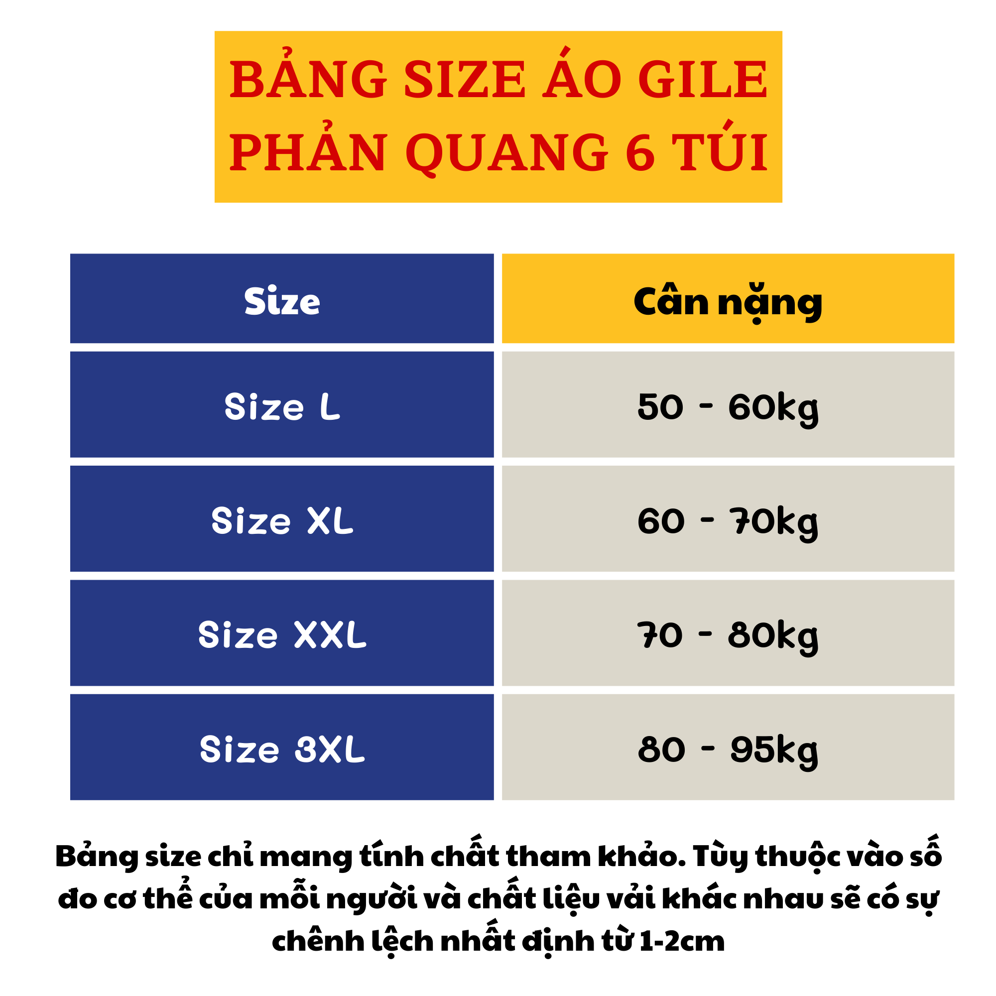 Lưu ý: Bảng size mang tính tham khảo, sai số 1–2cm tùy cơ địa và chất liệu vải.