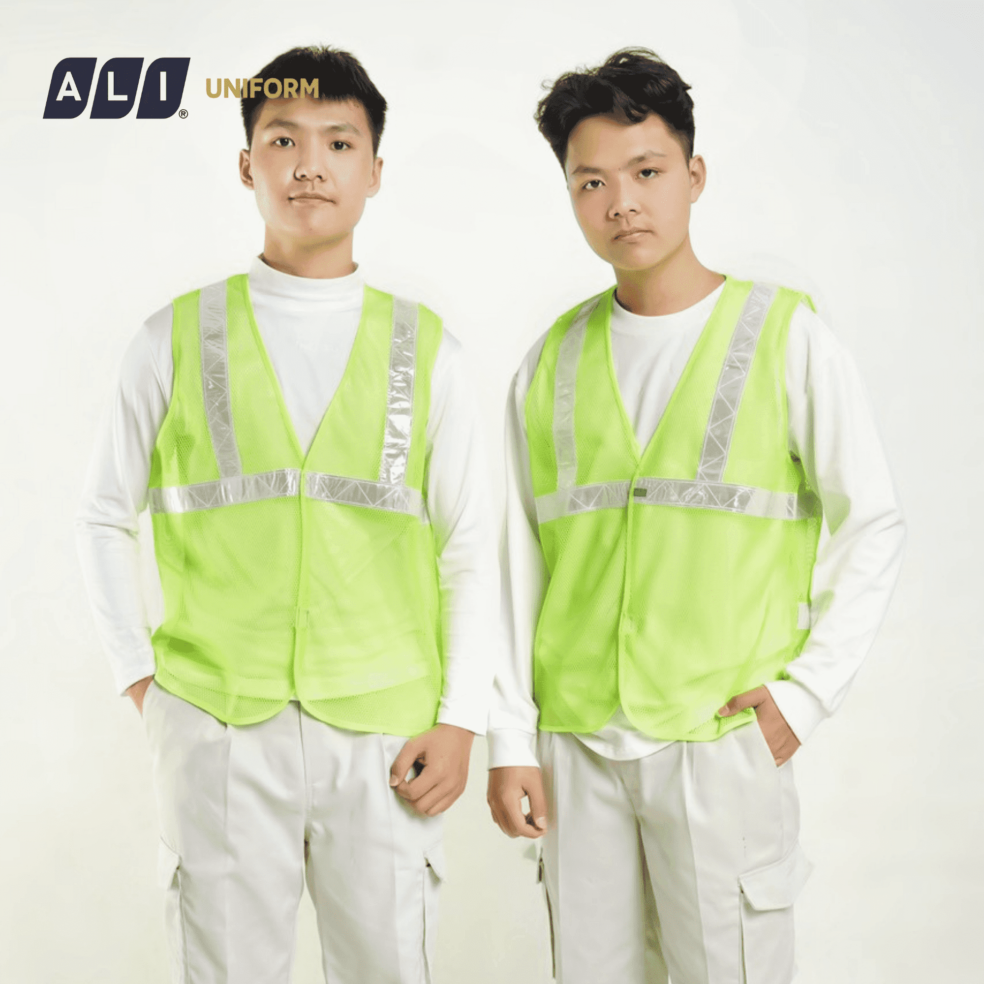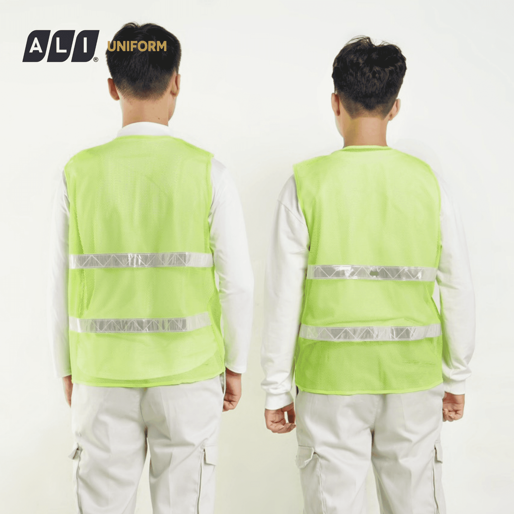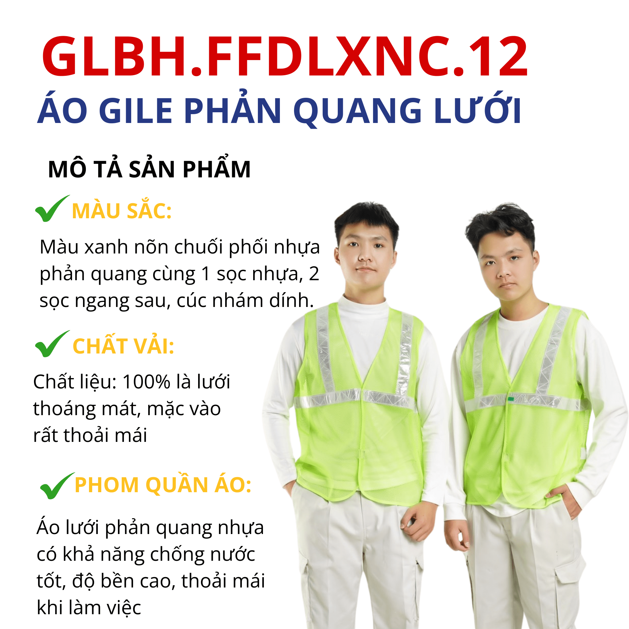 - Thiết kế: Áo may dây phản quang trước ngực và phía sau