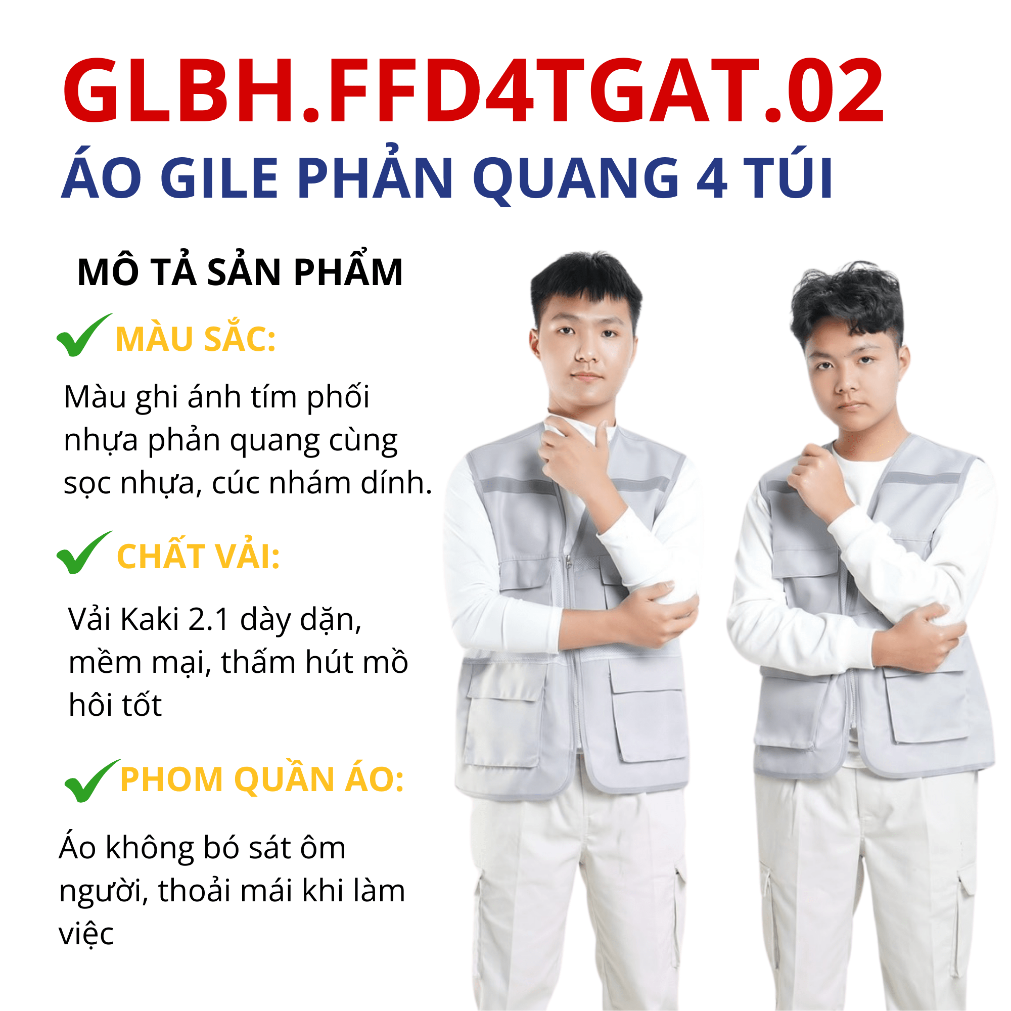 - Chất liệu: Vải kaki hoặc vải lưới, thêm sợi phản quang