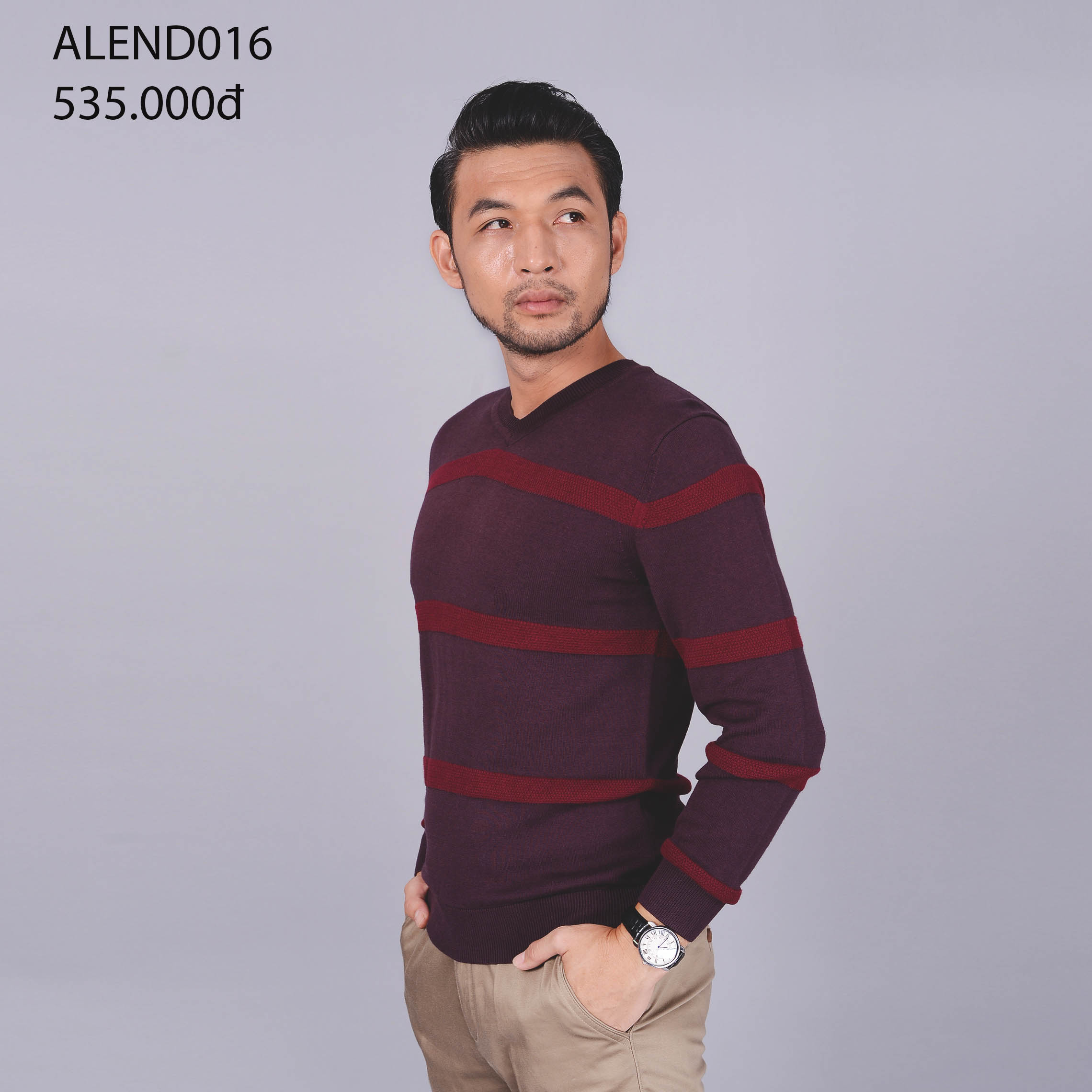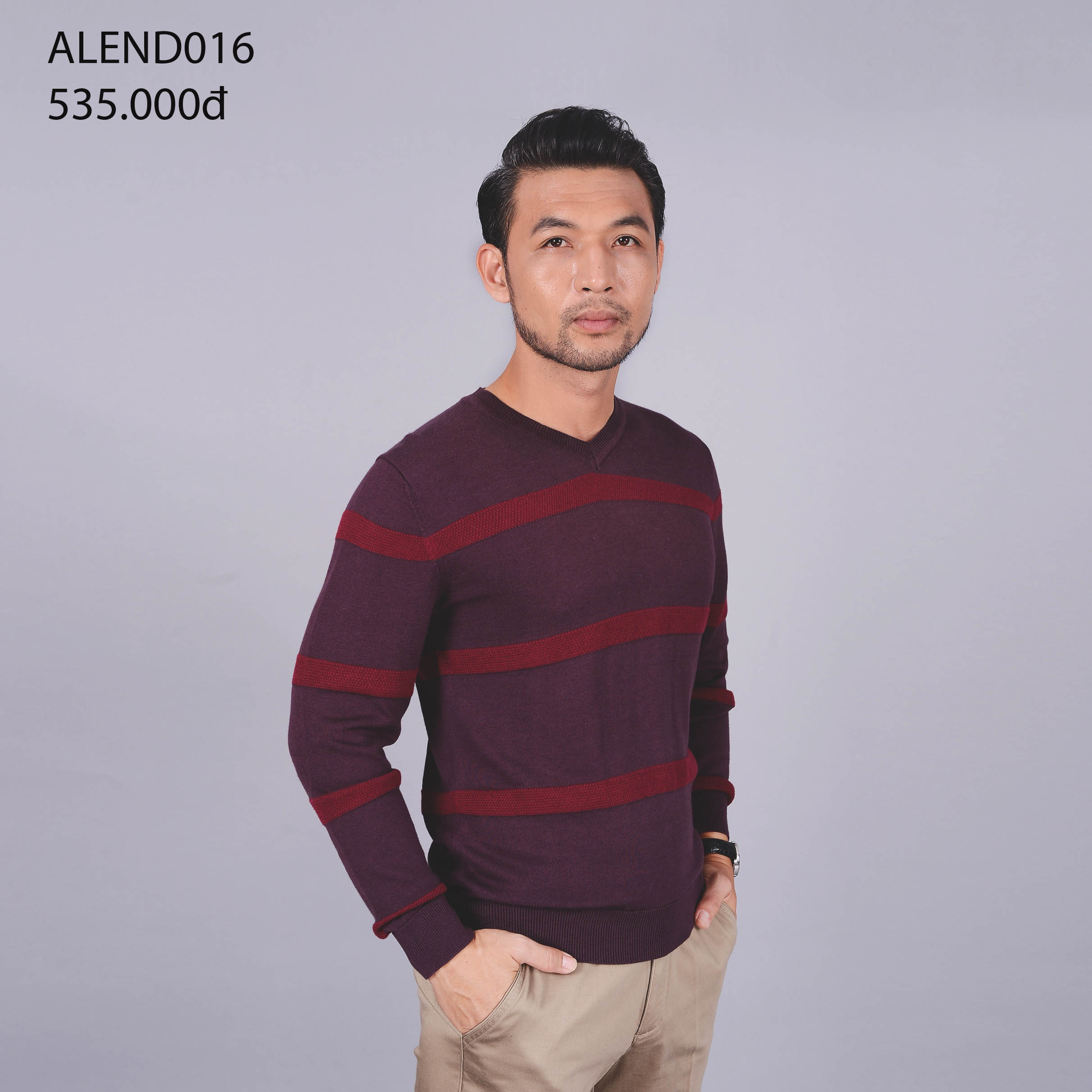 Áo len dài tay ALEND016 cổ tim- nâu kẻ