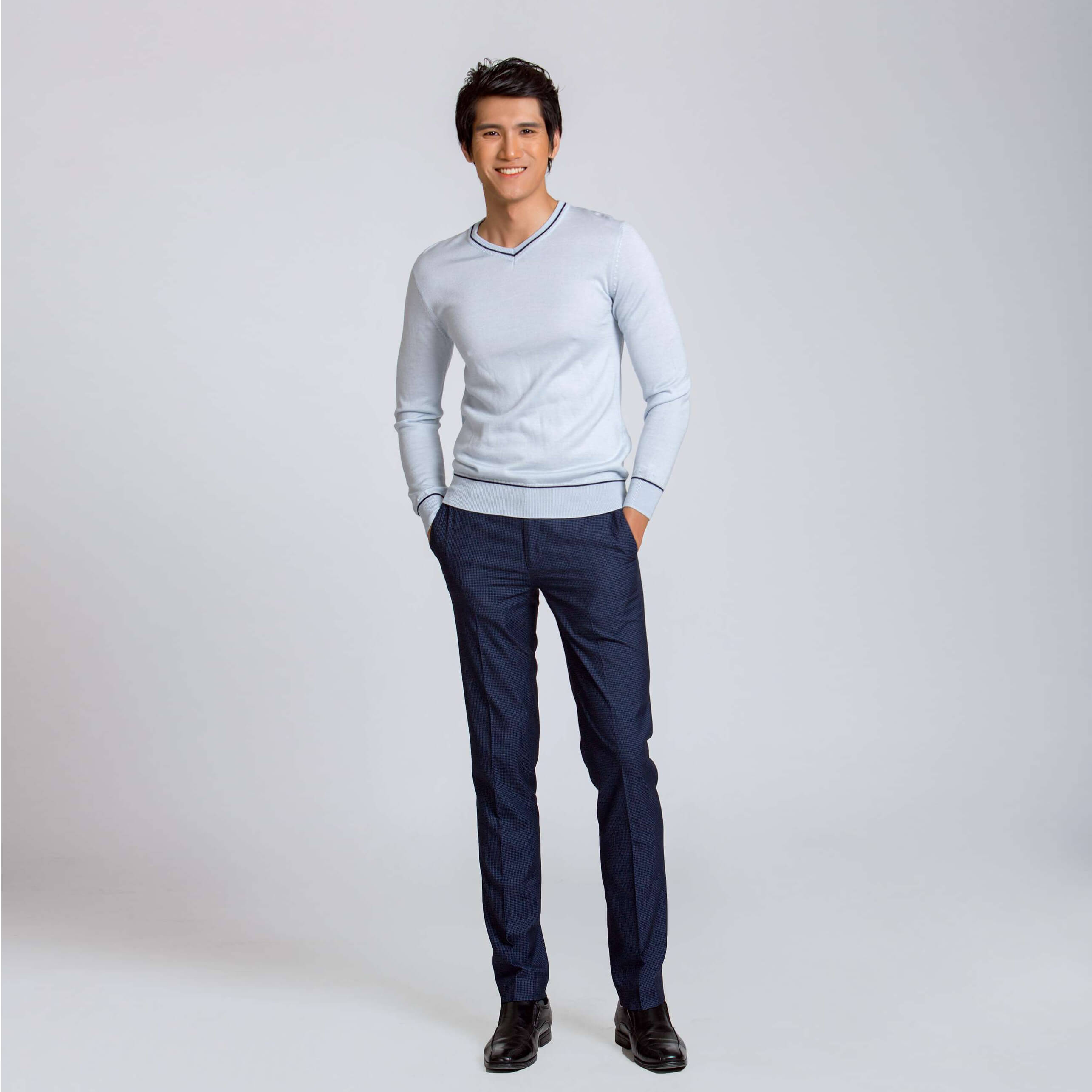 Bạn có thể dễ dàng kết hợp áo len nam xanh dương nhạt ALEND043 cùng:
