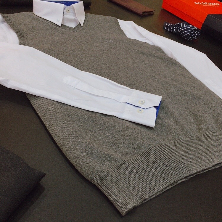 - Áo gilê len cổ tim kết hợp với áo sơ mi dài tay và áo khoác là một sự lựa chọn thú vị cho nam giới trong mùa thu đông này.