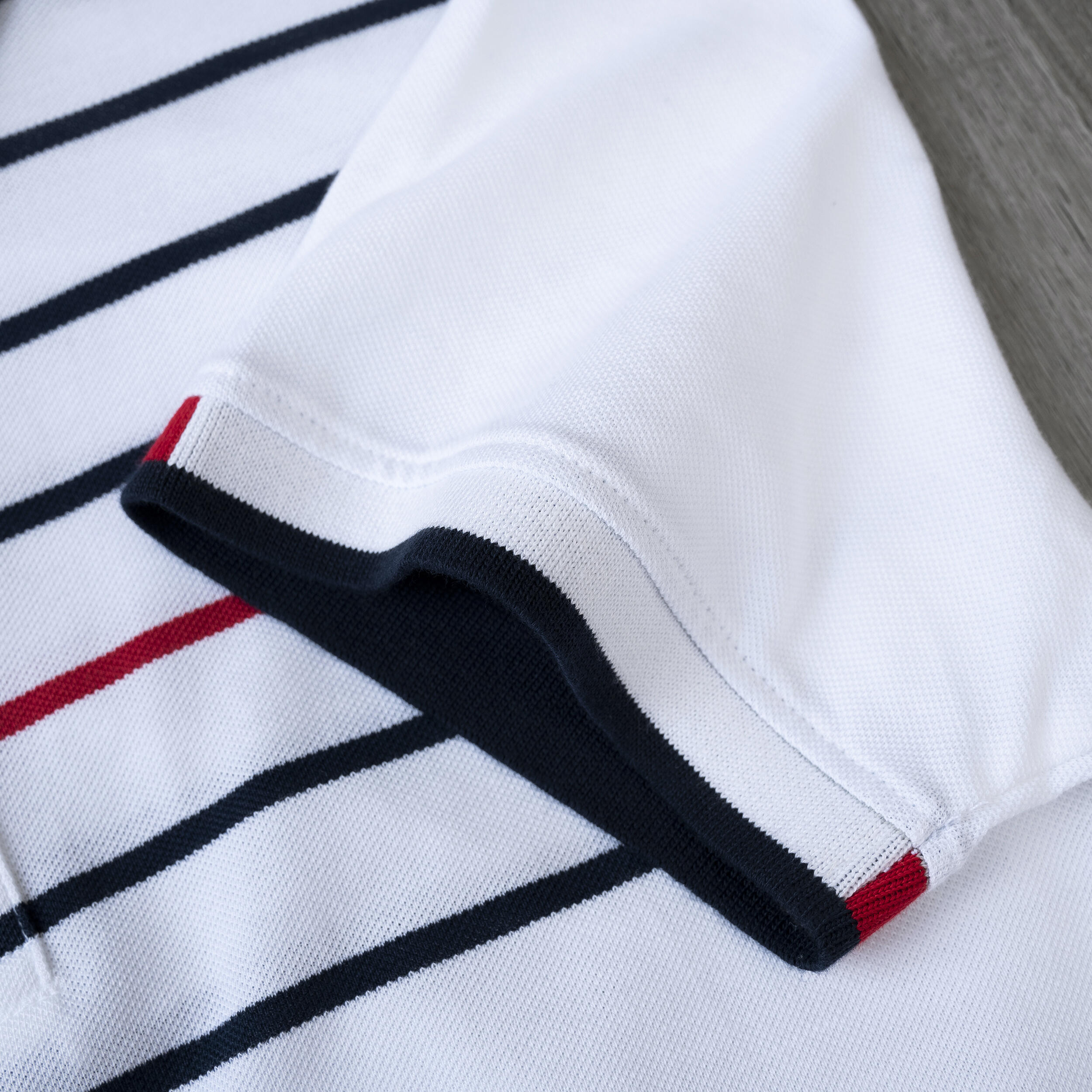 + Thiết kế hiện đại với cổ áo và tay áo bo dệt chỉn chu, gấu áo xẻ tà hai bên được hoàn thiện bằng dây dệt 3 màu độc đáo – chi tiết tạo điểm nhấn nổi bật cho tổng thể.