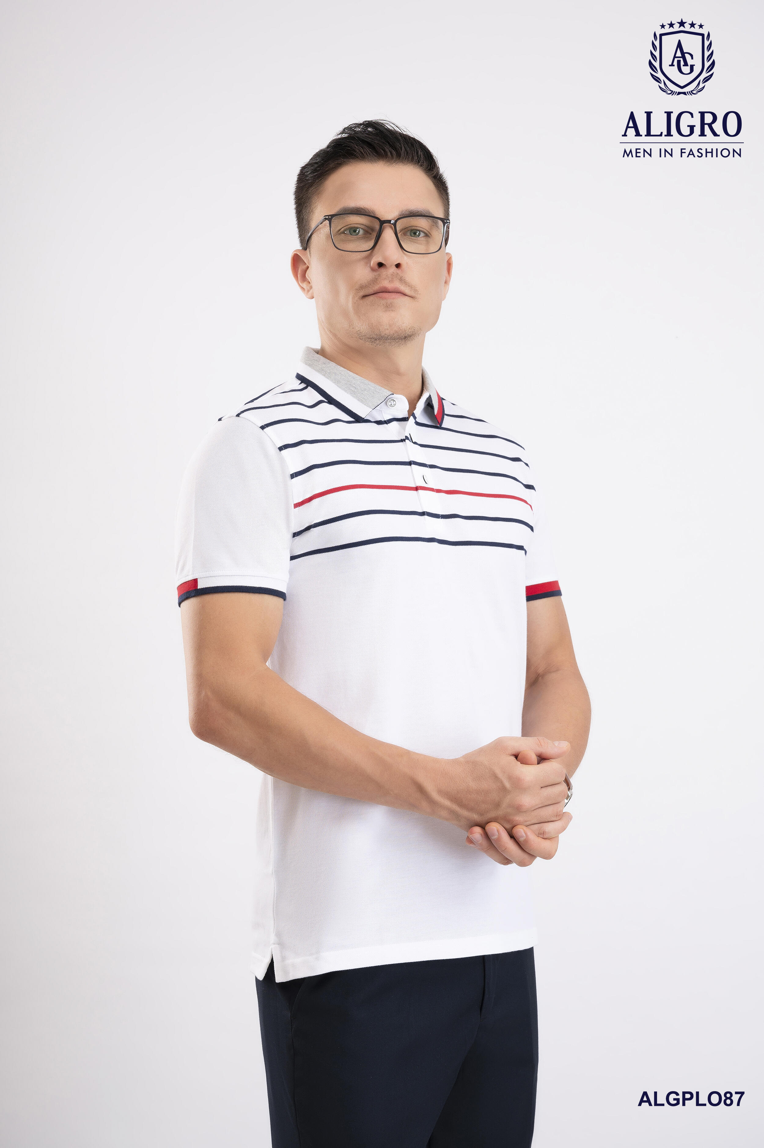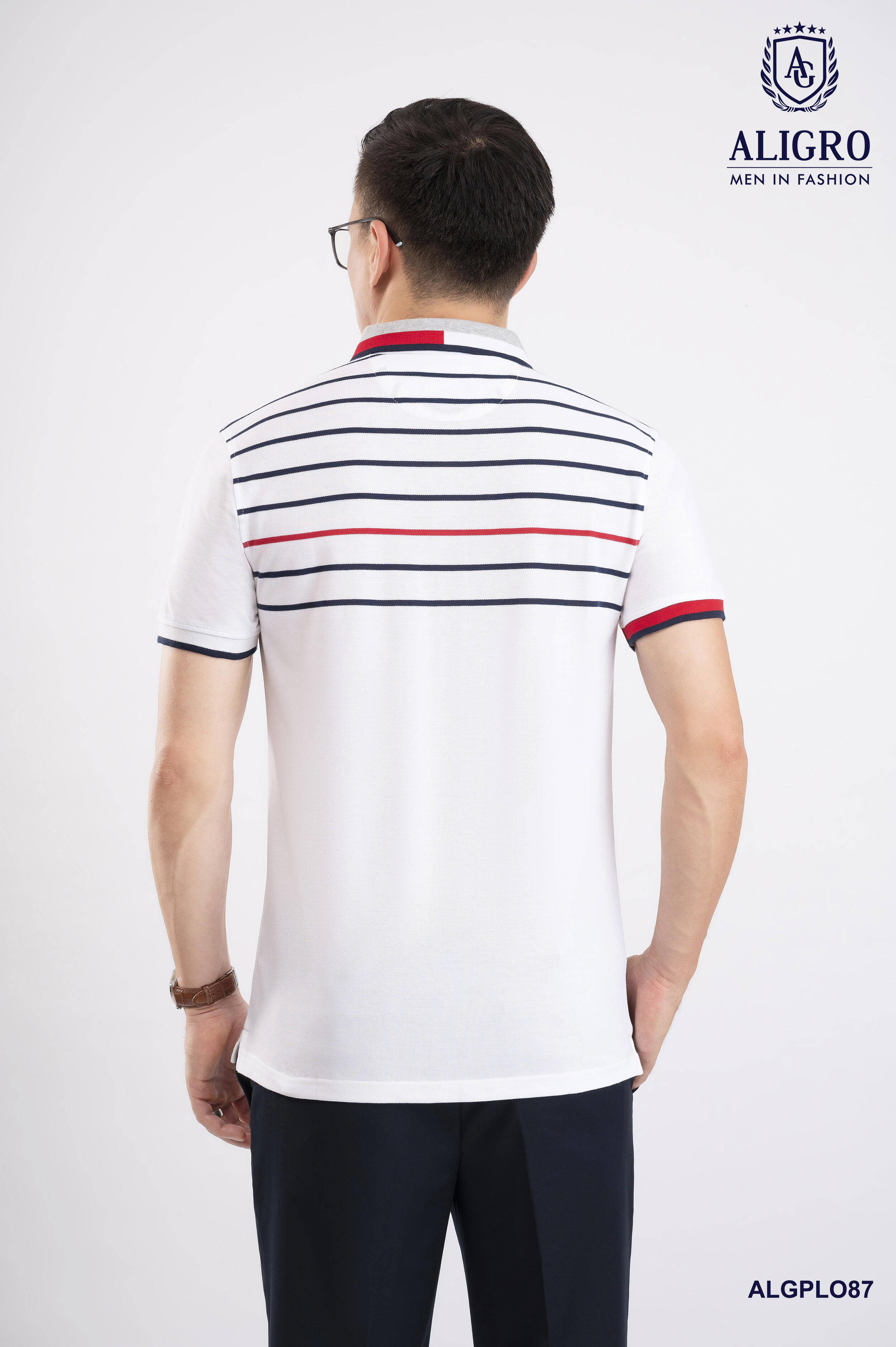 Áo polo nam ngắn tay cao cấp Aligro ALGPLO87 chất liệu 100% cotton form SLIMFIT kẻ ngang trắng-đỏ-đen