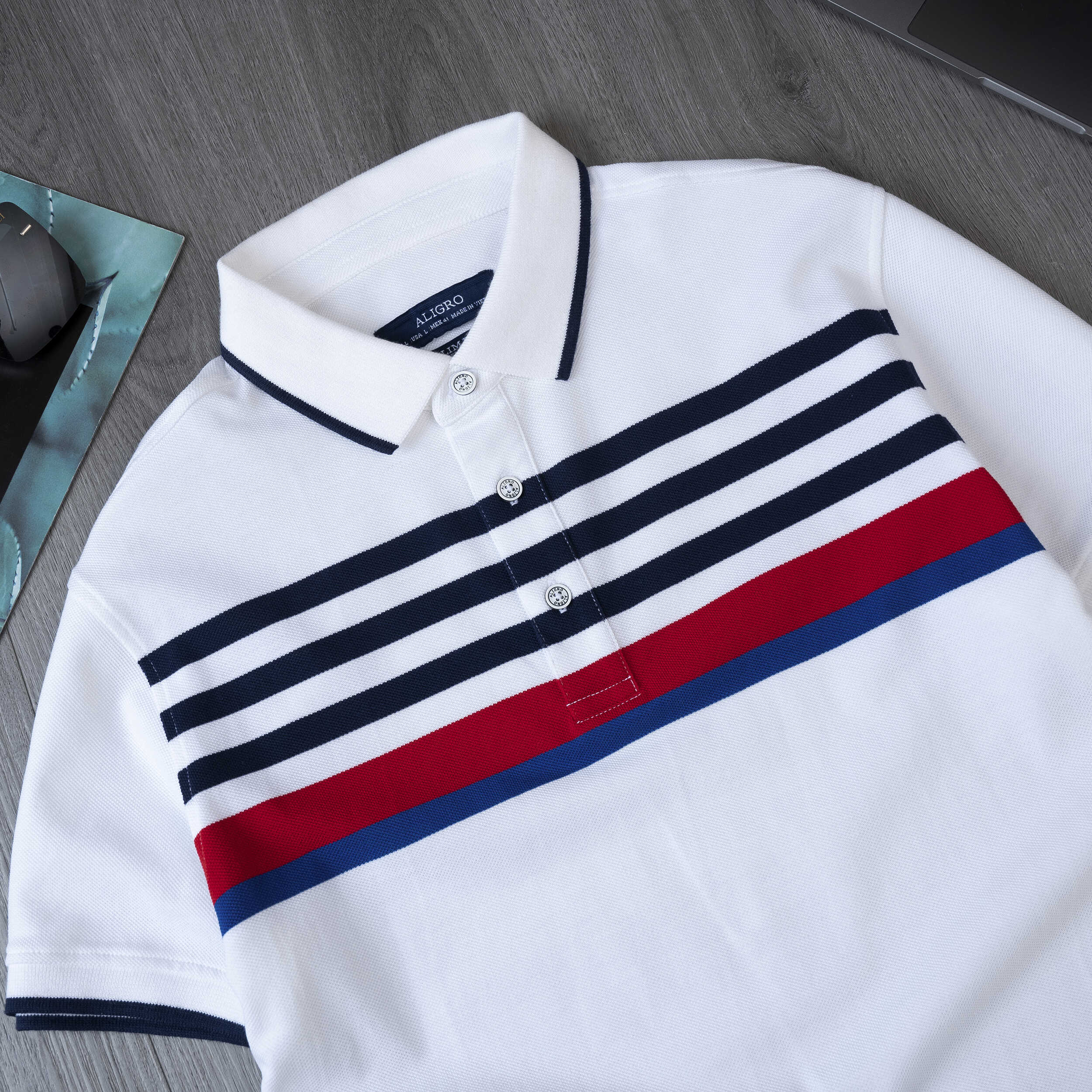 Áo Polo nam ngắn tay trắng kẻ ngang navy-đỏ-xanh ALGPLO126