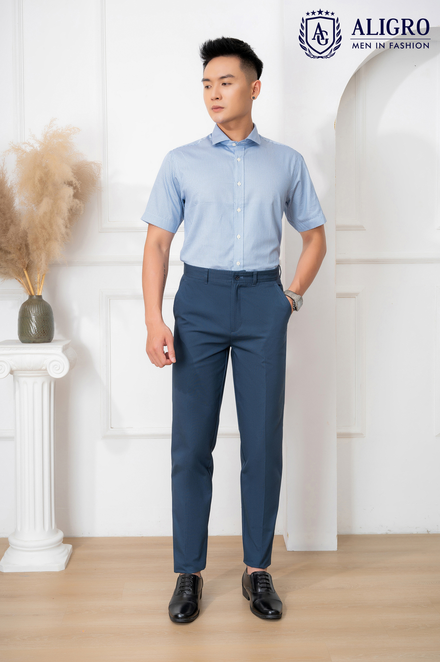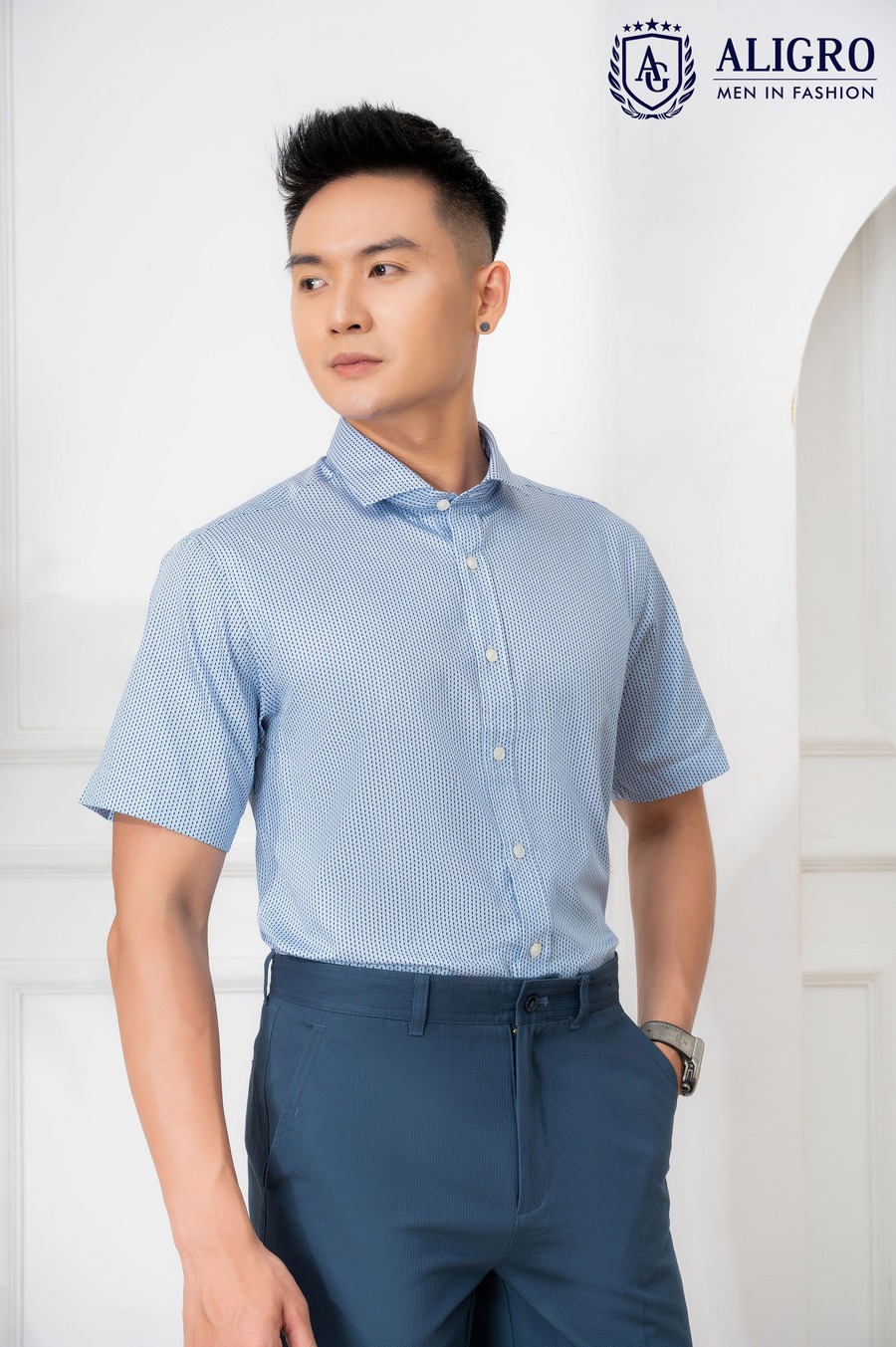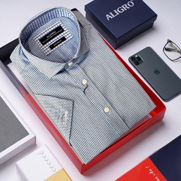 Áo sơ mi nam ngắn tay cao cấp Aligro ALGS-C85 vải cotton form Customfit màu xanh chấm đen