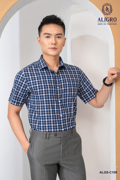 Áo sơ mi nam ngắn tay cao cấp Aligro ALGS-C109 chất liệu vải bamboo form SLIMFIT kẻ ô vuông navy