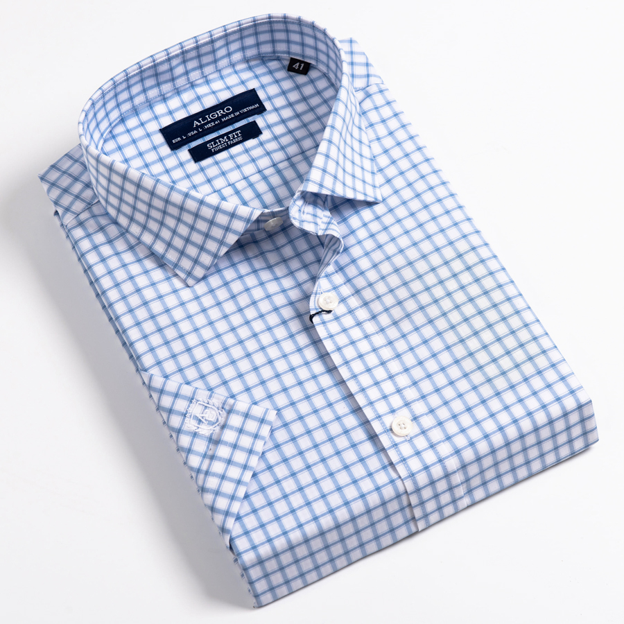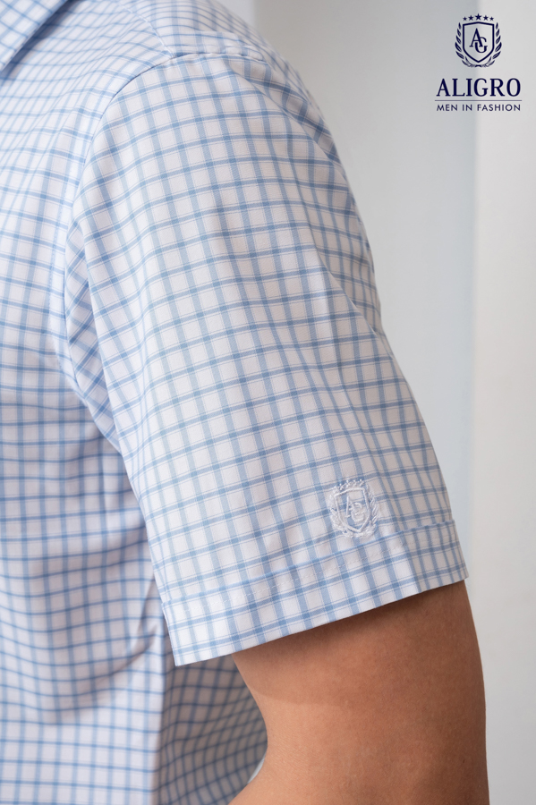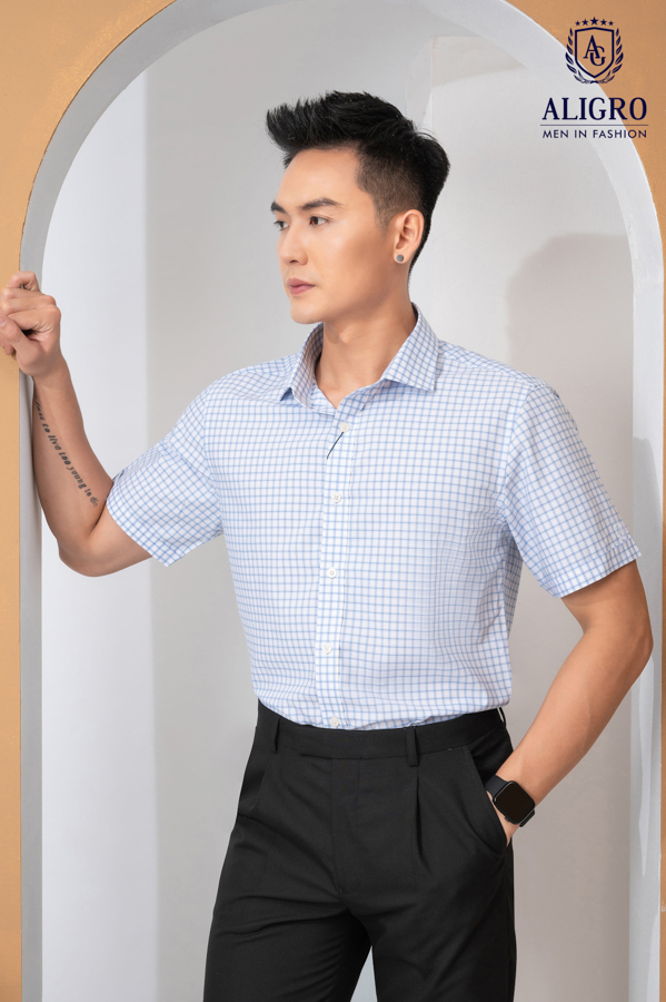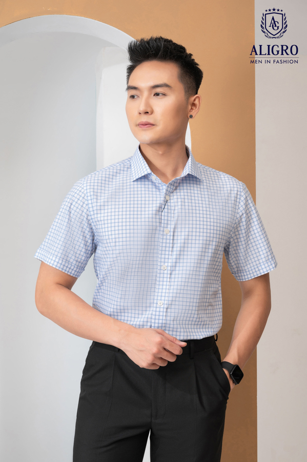 Áo sơ mi nam ngắn tay cao cấp Aligro ALGS-C116 chất liệu vải bamboo form SLIMFIT kẻ caro xanh