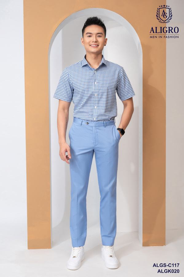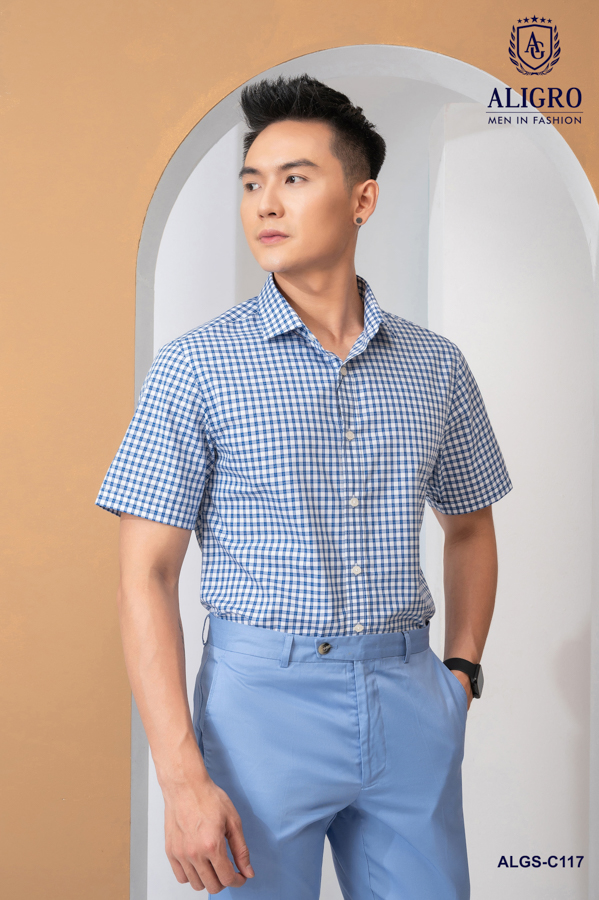 Áo sơ mi nam ngắn tay cao cấp Aligro ALGS-C117 chất liệu vải bamboo form SLIMFIT kẻ caro xanh navy