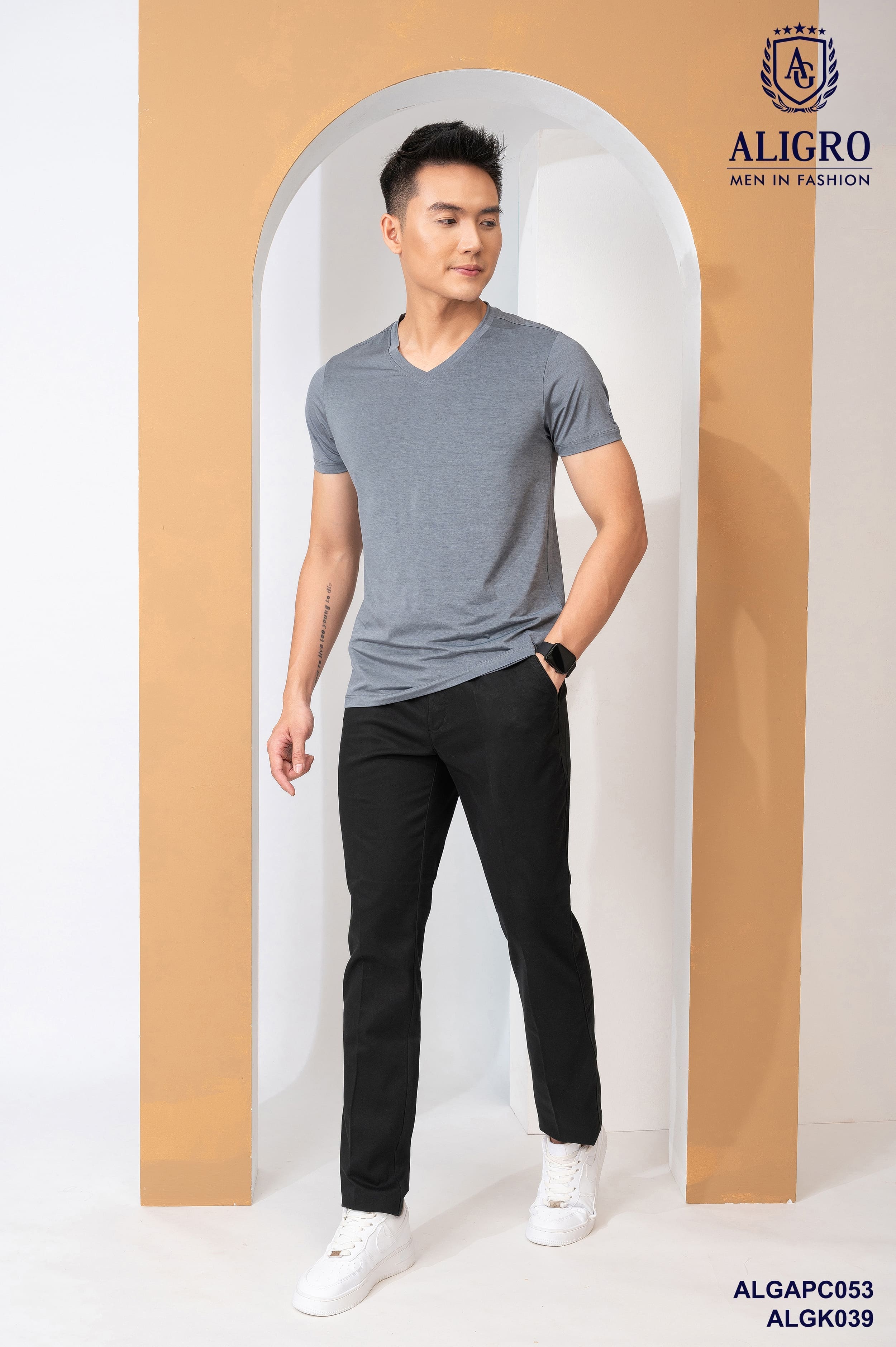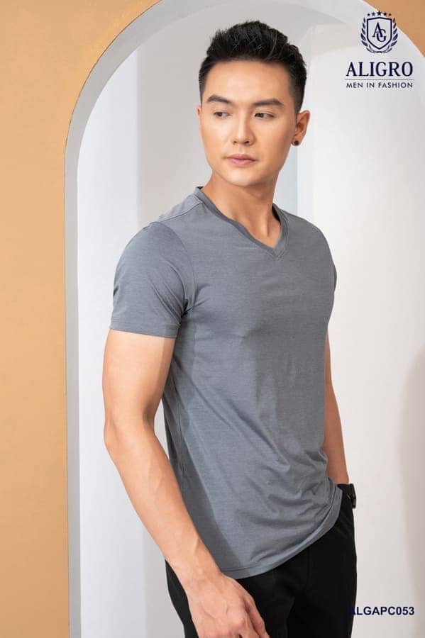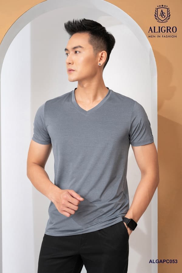 Áo thun nam cổ tim ngắn tay cao cấp Aligro ALGAPC053 chất liệu cotton form SLIMFIT màu grey