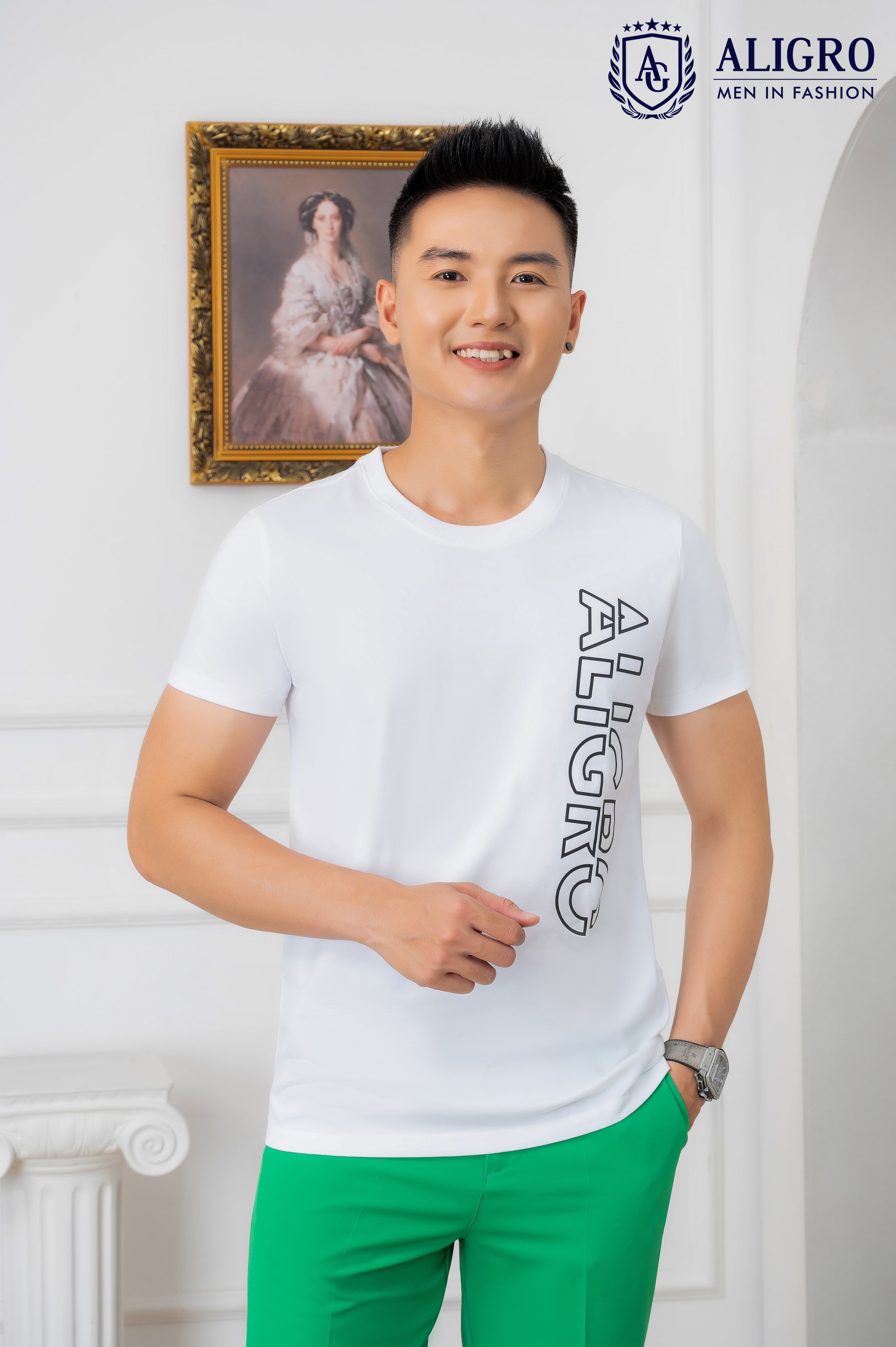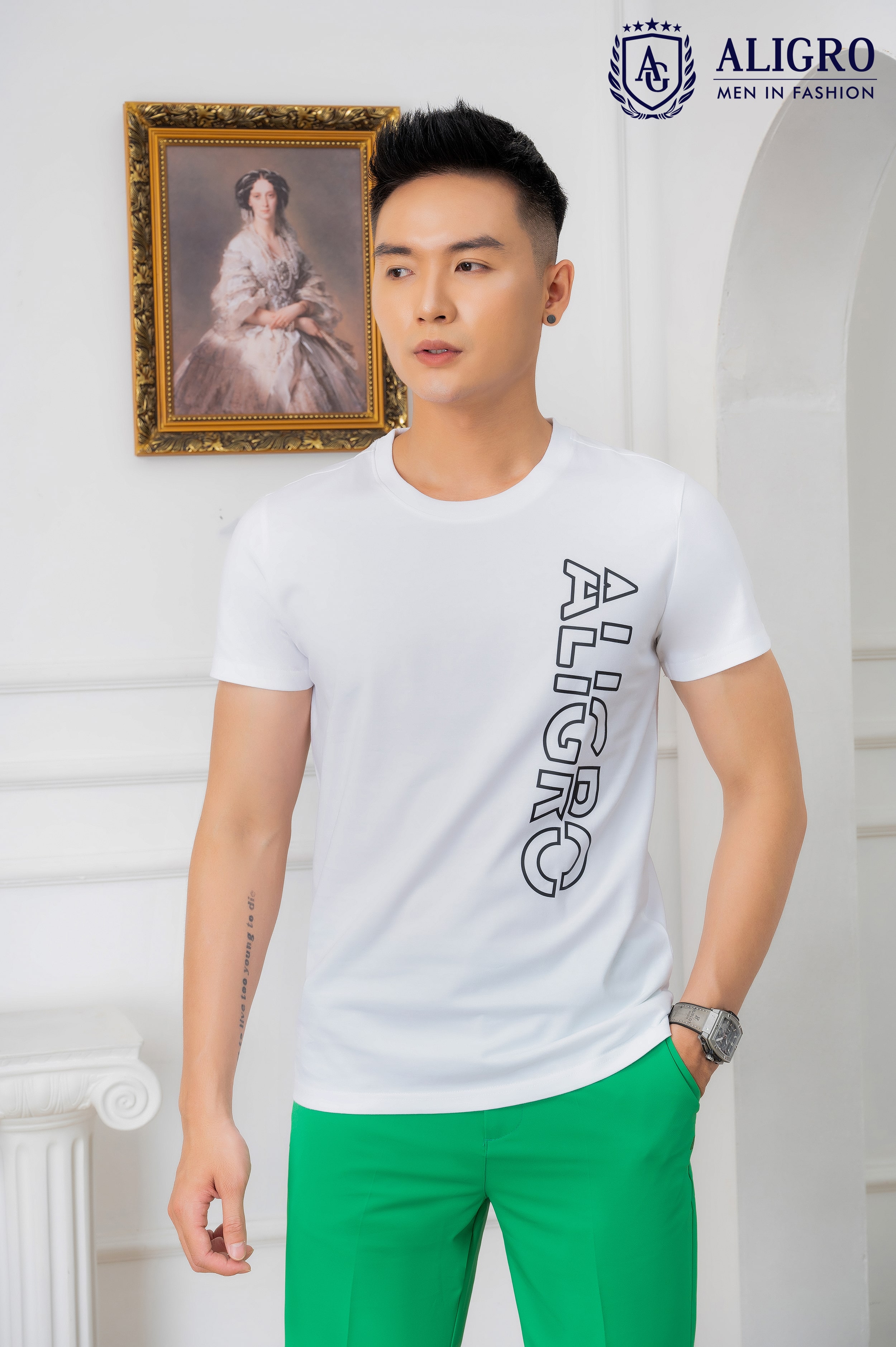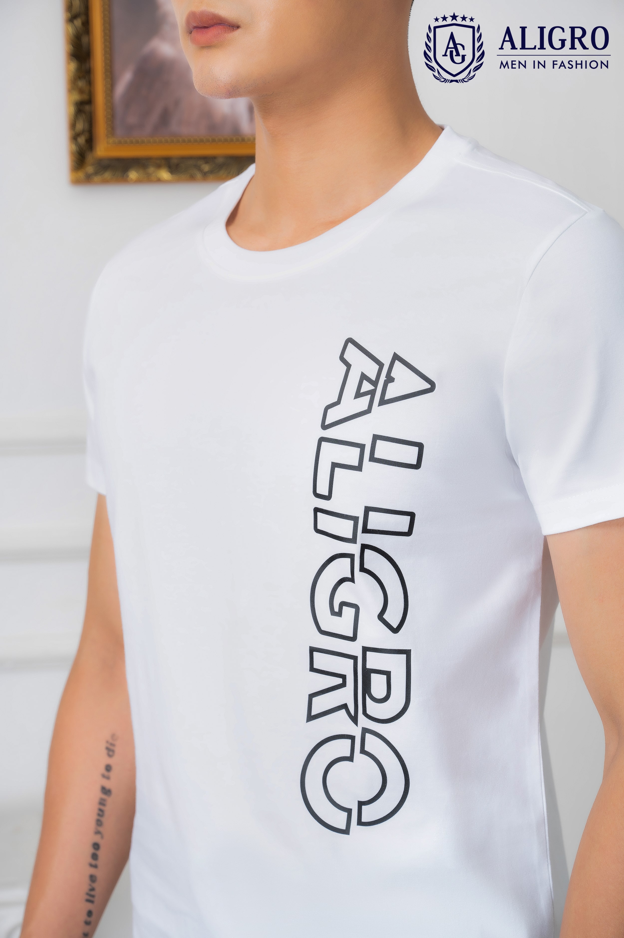 Áo thun nam cổ tròn ngắn tay cao cấp Aligro ALGAPC071 chất liệu cotton form SLIMFIT màu trắng in thân
