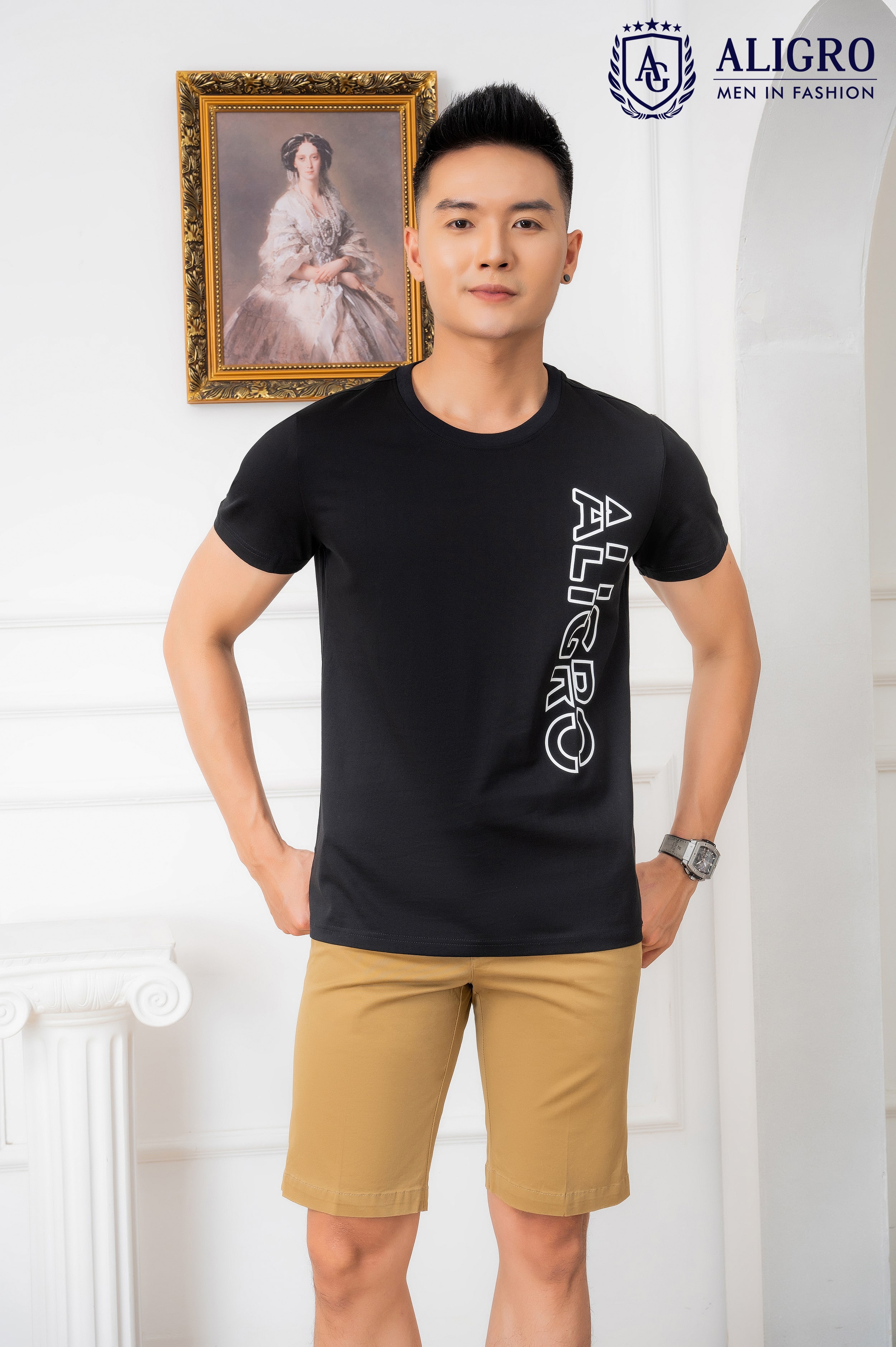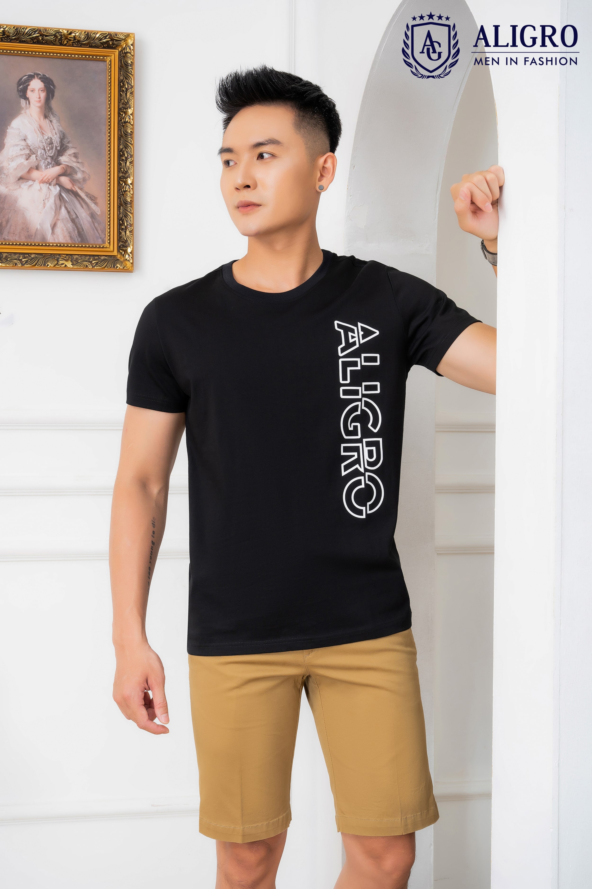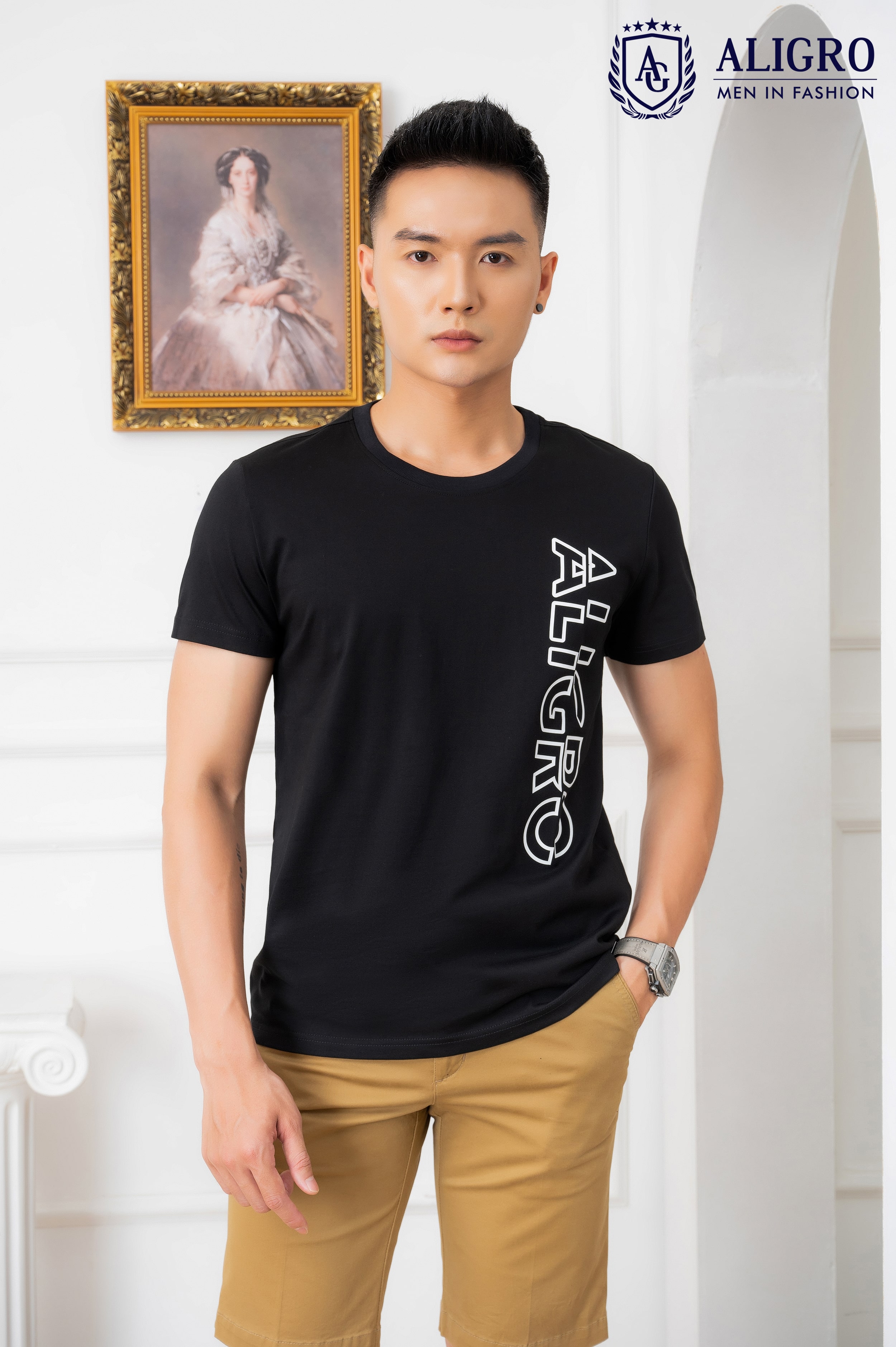 Áo thun nam cổ tròn ngắn tay cao cấp Aligro ALGAPC072 chất liệu cotton form SLIMFIT màu đen in thân