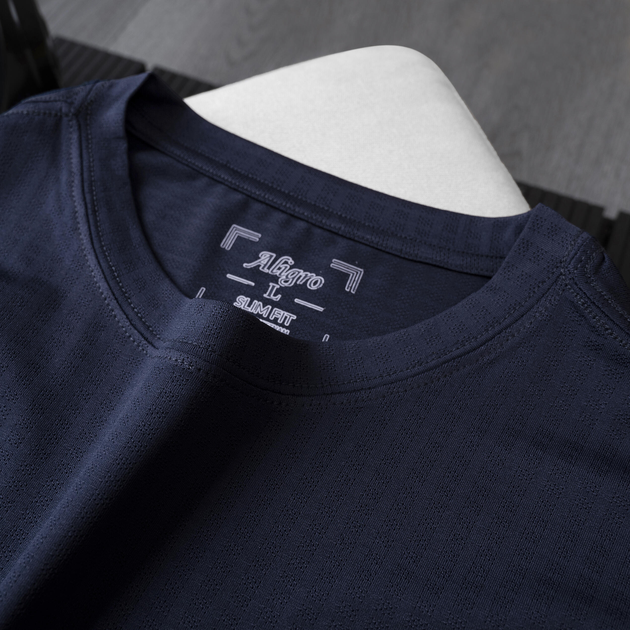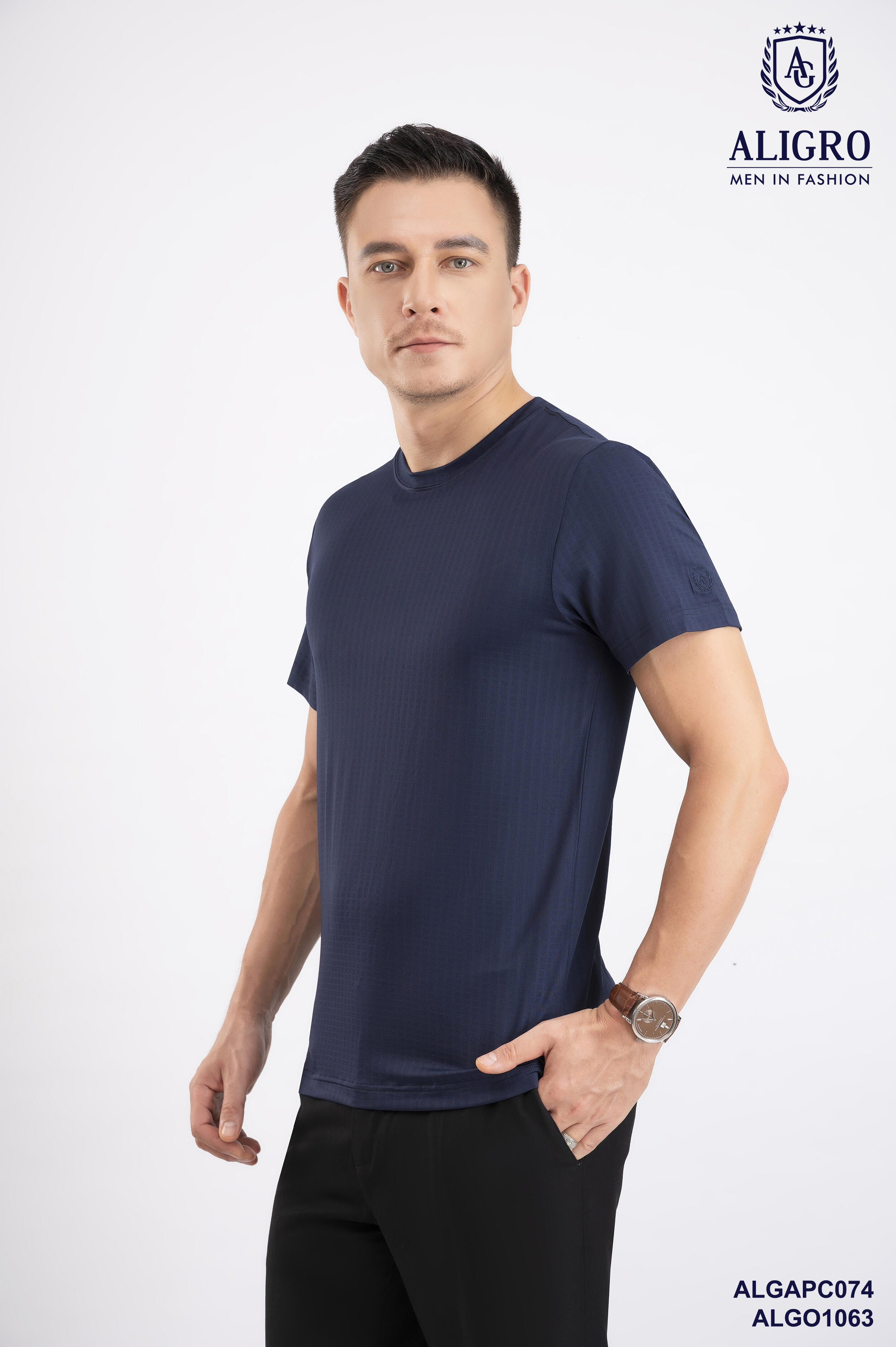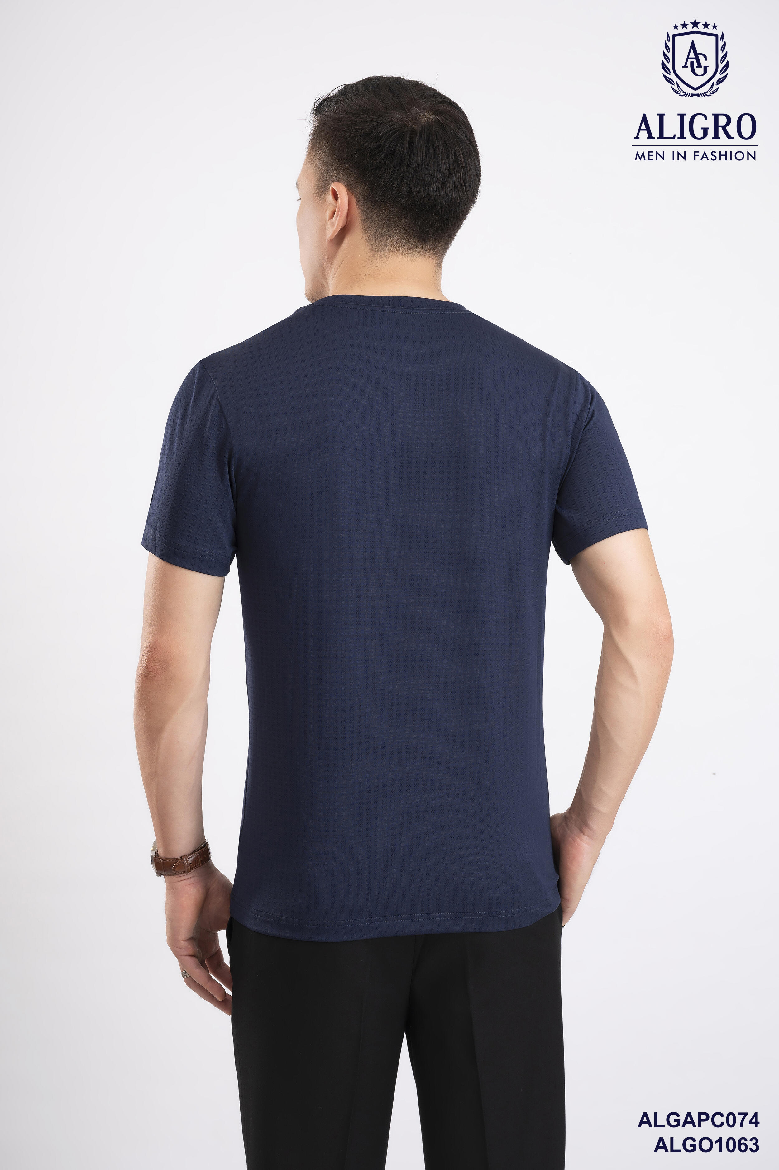 Áo thun nam cổ tròn ngắn tay cao cấp Aligro ALGAPC074 chất liệu cotton form SLIMFIT ô chấm màu navy