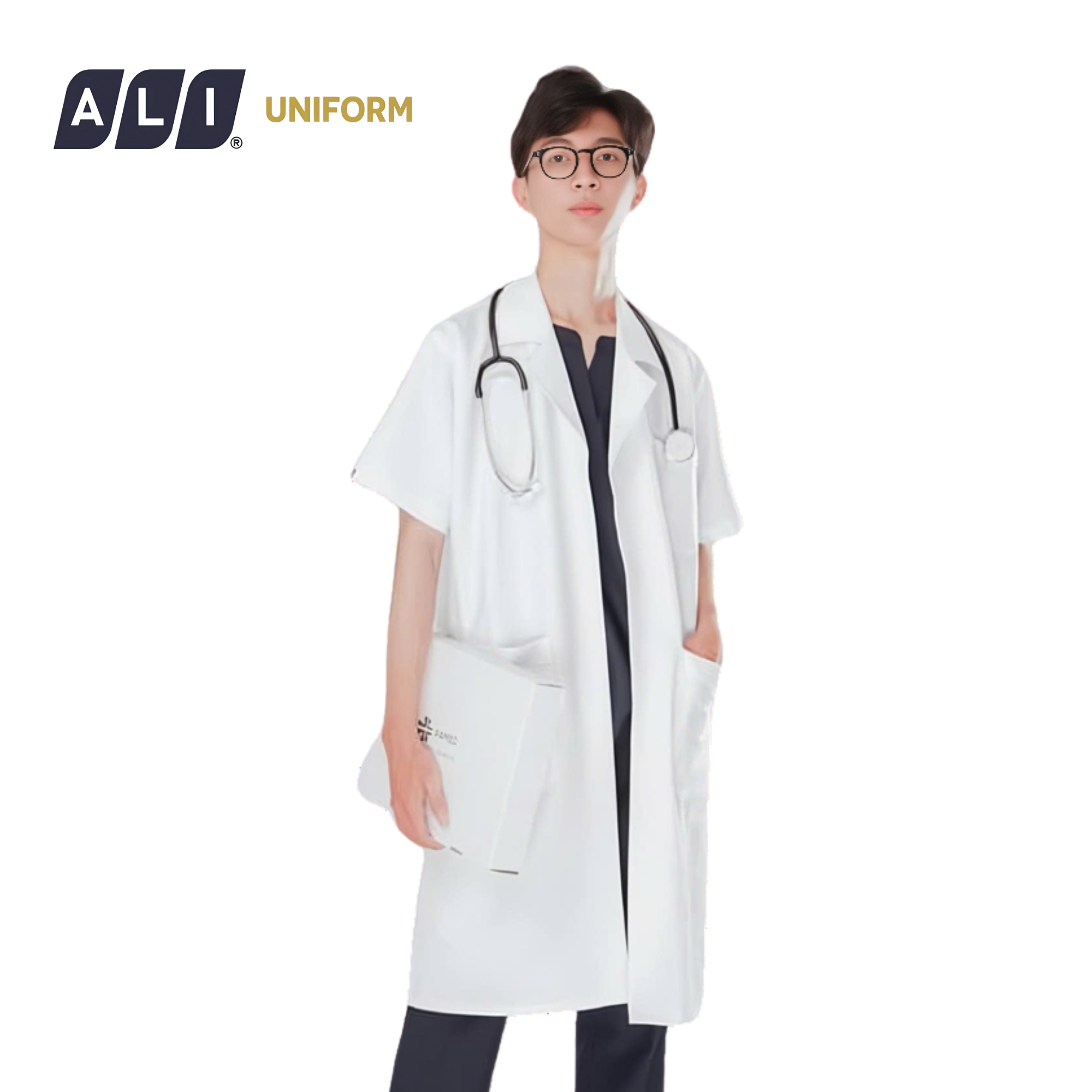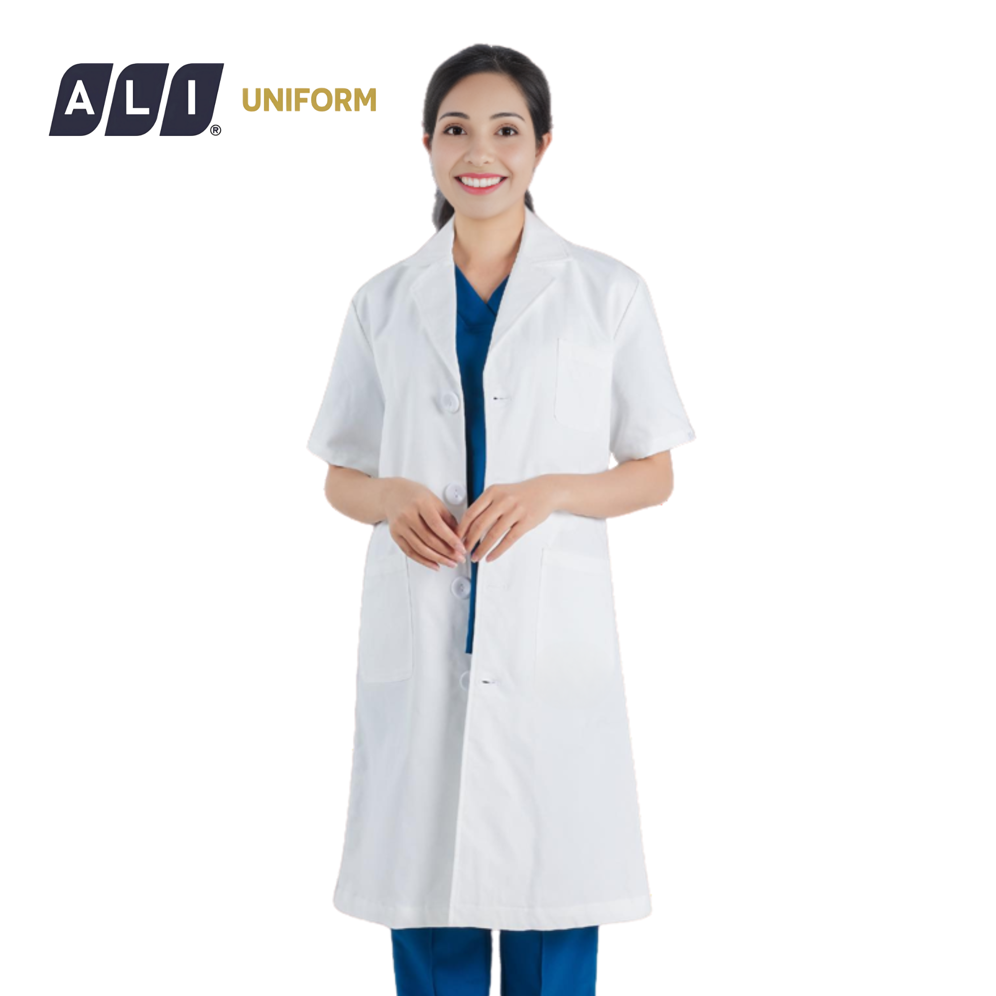 Áo choàng blouse, áo blue trắng cộc tay, dáng dài, chất vải kaki chun hàn cho bác sĩ, dược sĩ, spa Aligro BV.CA.ABLU.KKC