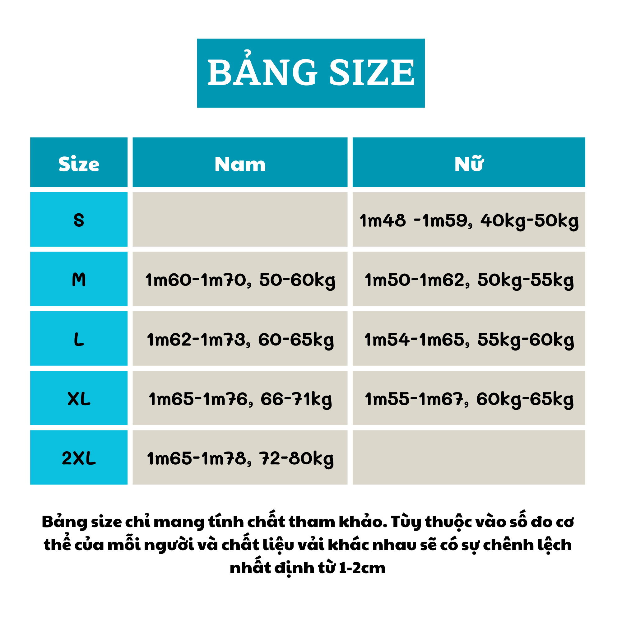 Lưu ý: Bảng size chỉ mang tính chất tham khảo. Tùy thuộc vào số đo cơ thể của mỗi người và chất liệu vải khác nhau sẽ có sự chênh lệch nhất định từ 1-2cm