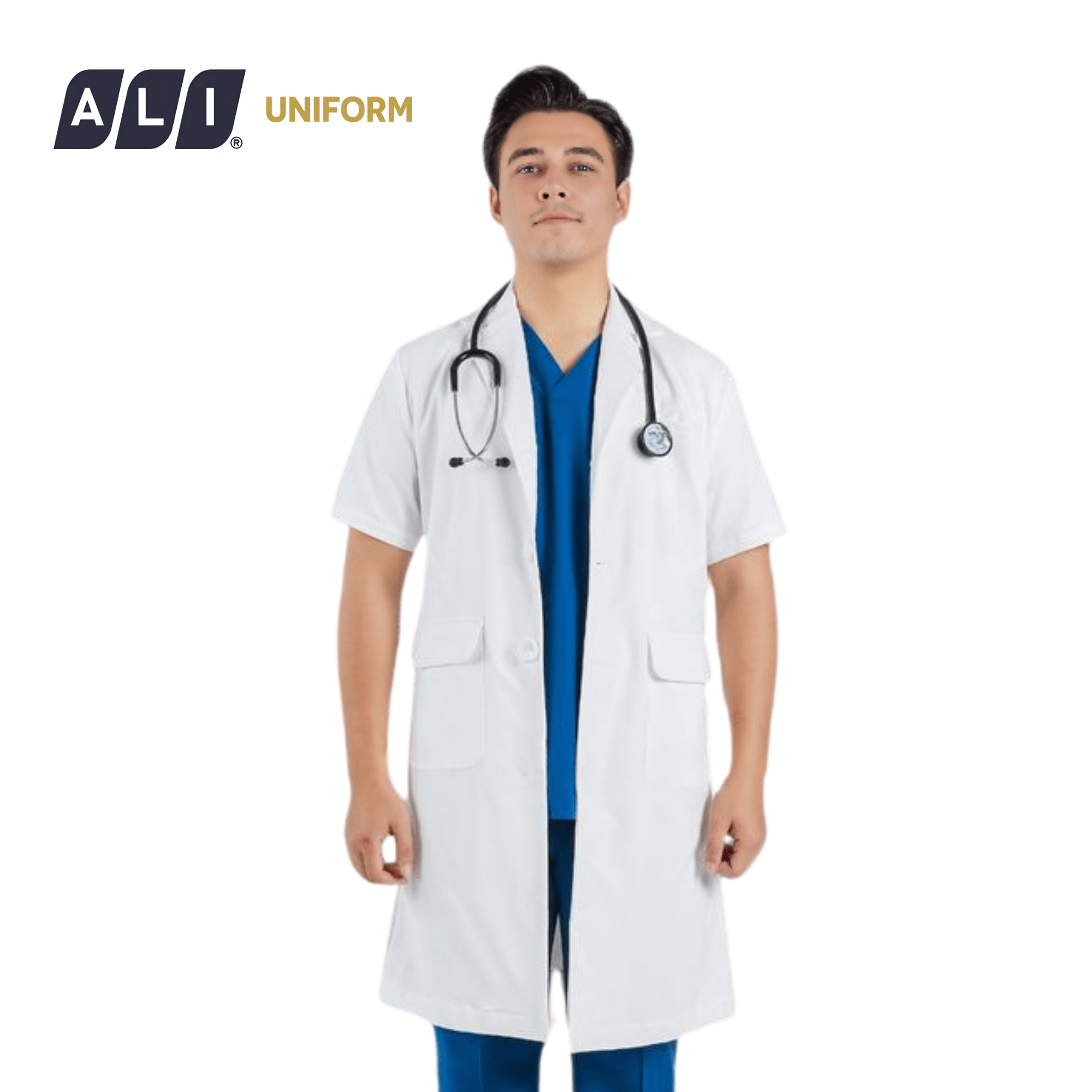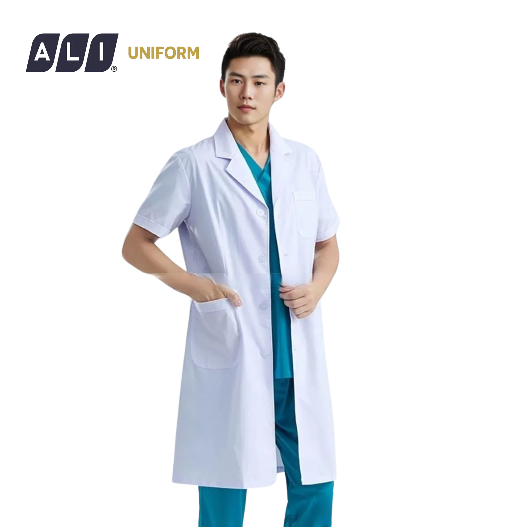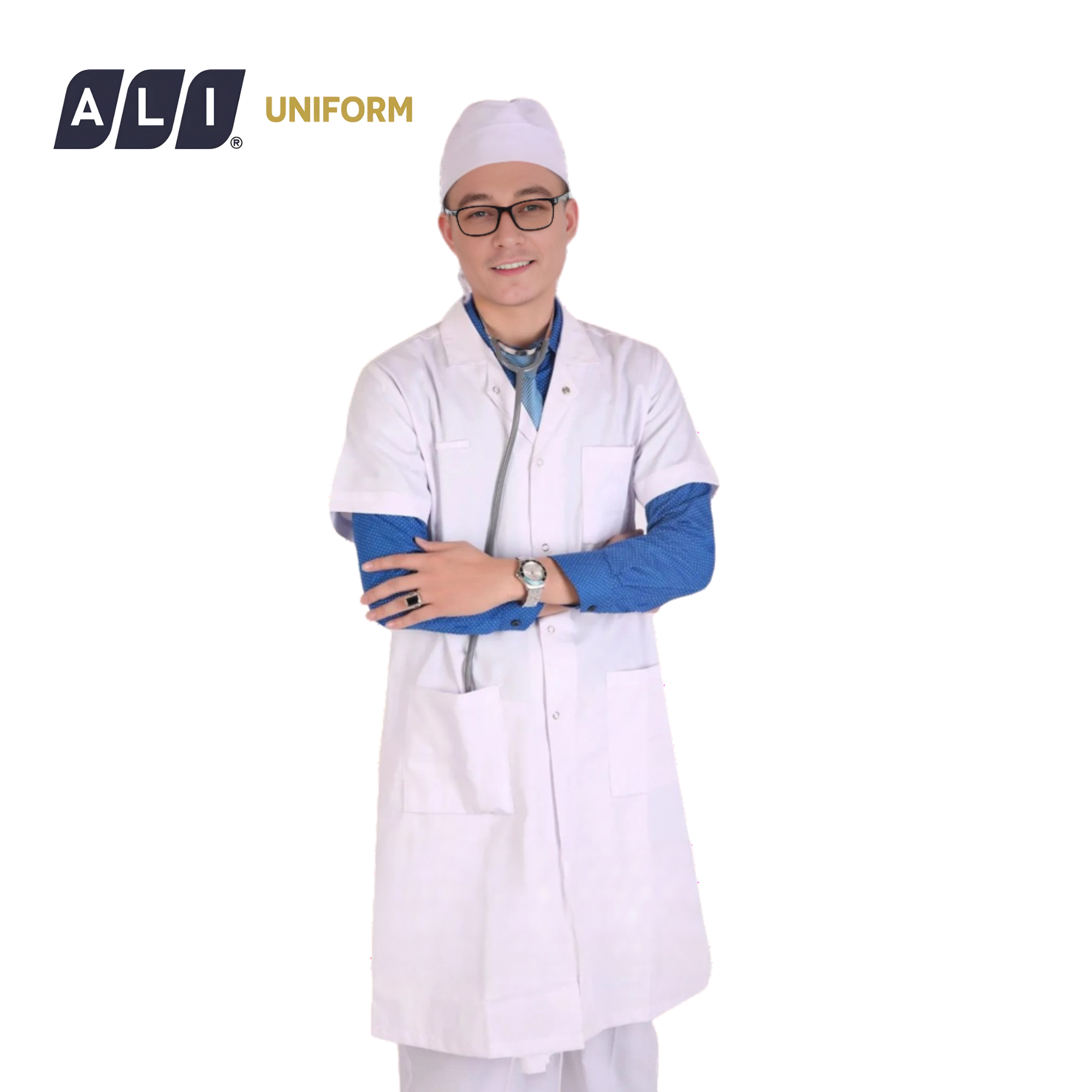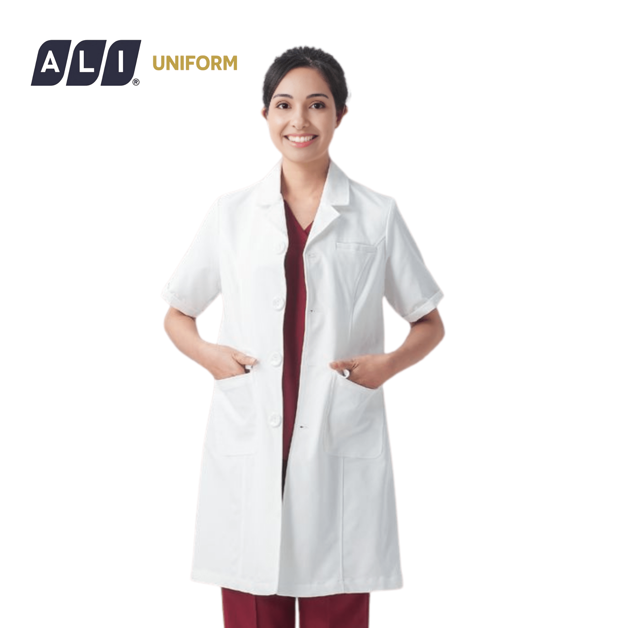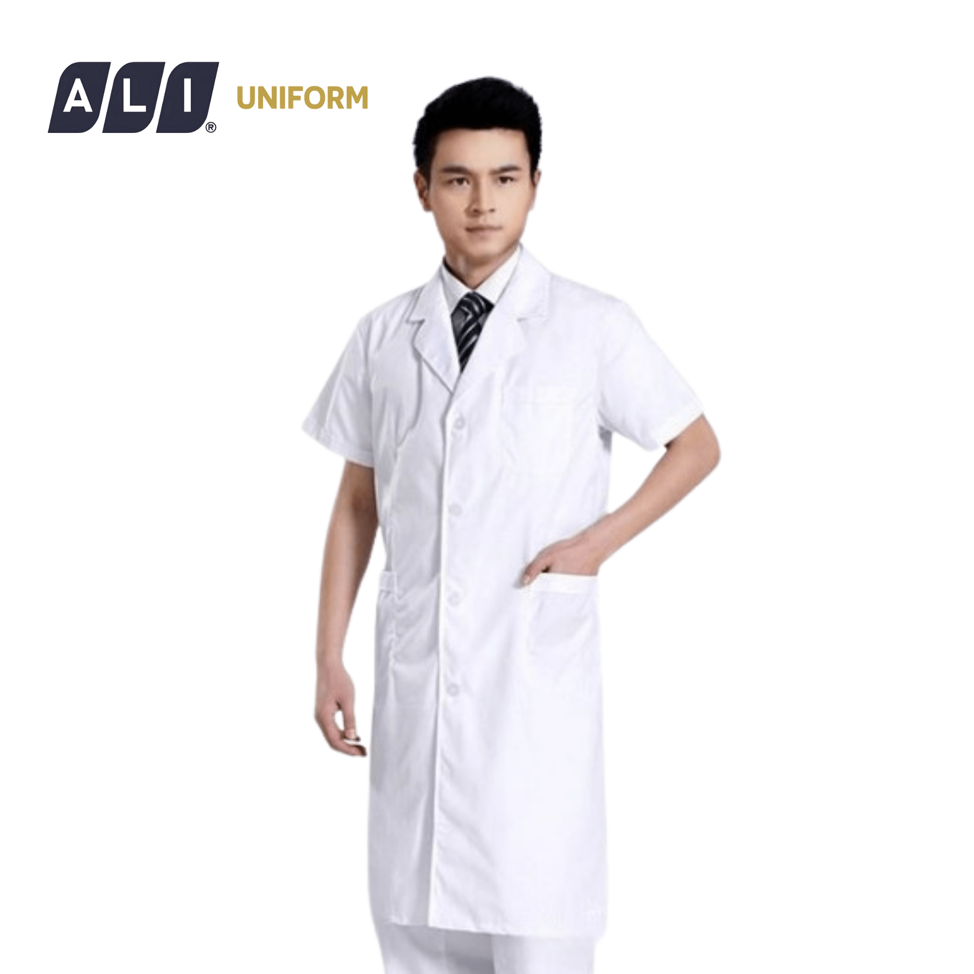 Áo choàng blouse, áo blue trắng cộc tay, dáng dài, chất vải lon ít nhăn cho bác sĩ, dược sĩ, spa Aligro BV.BM.ABLU