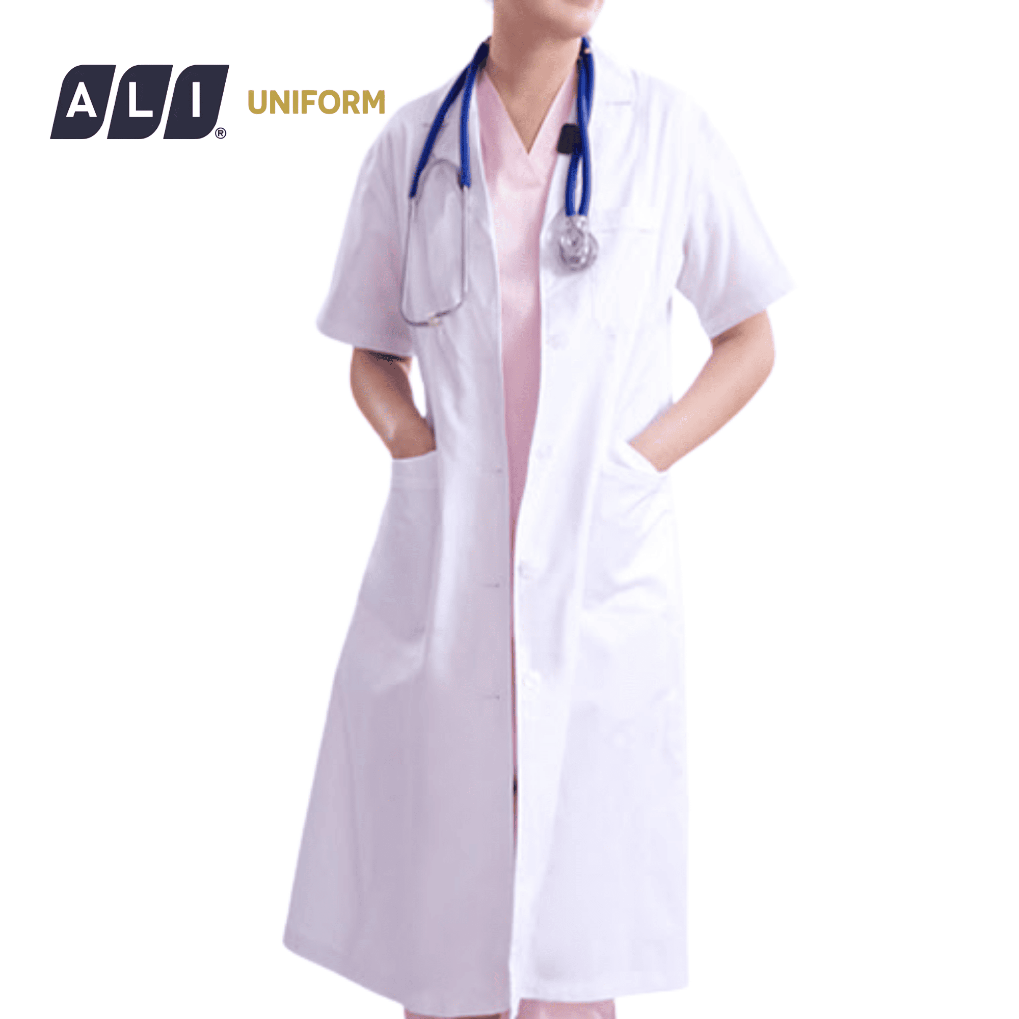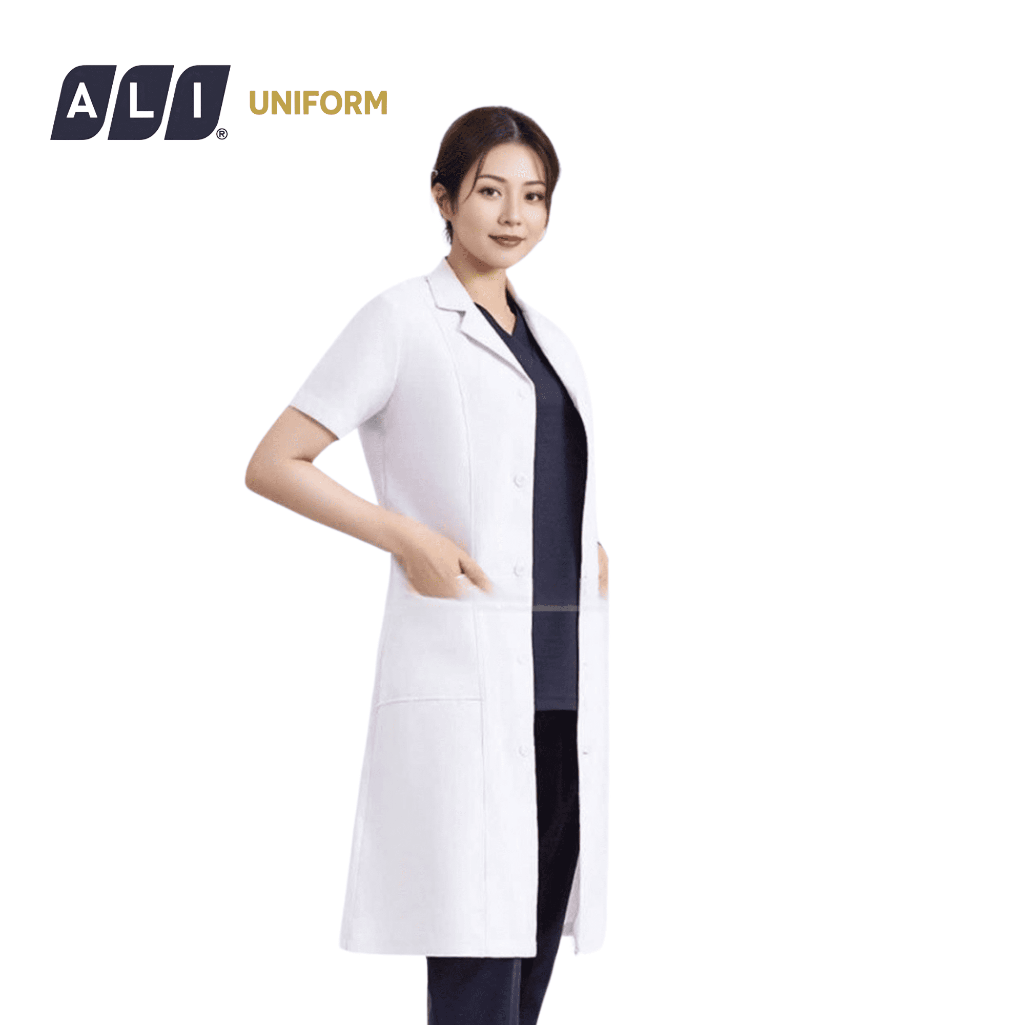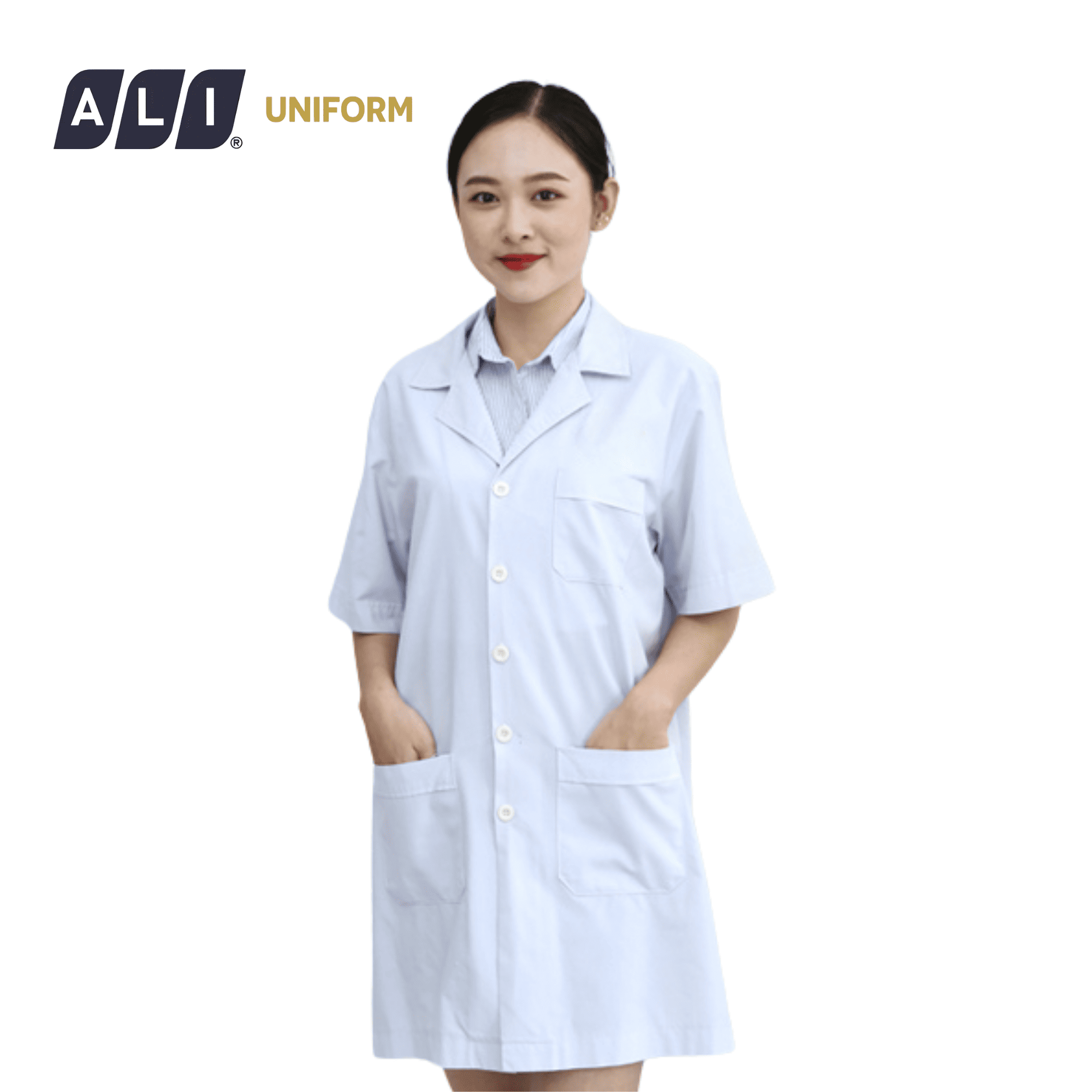 Áo choàng blouse, áo blue trắng cộc tay, dáng dài, chất vải oxford cho bác sĩ, dược sĩ, spa Aligro BV.CA.ABLU.OXC