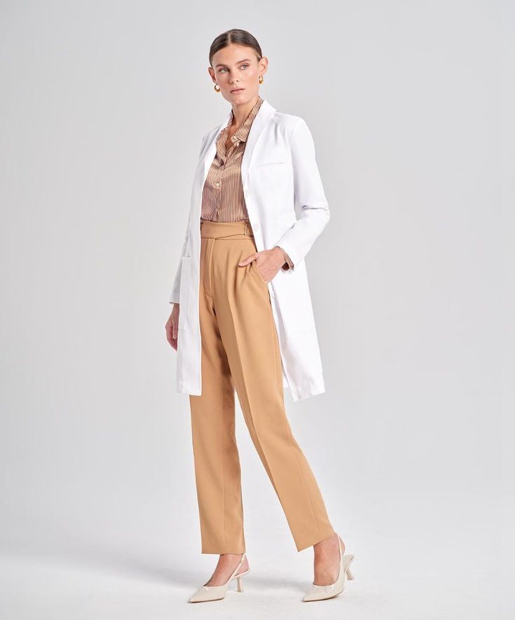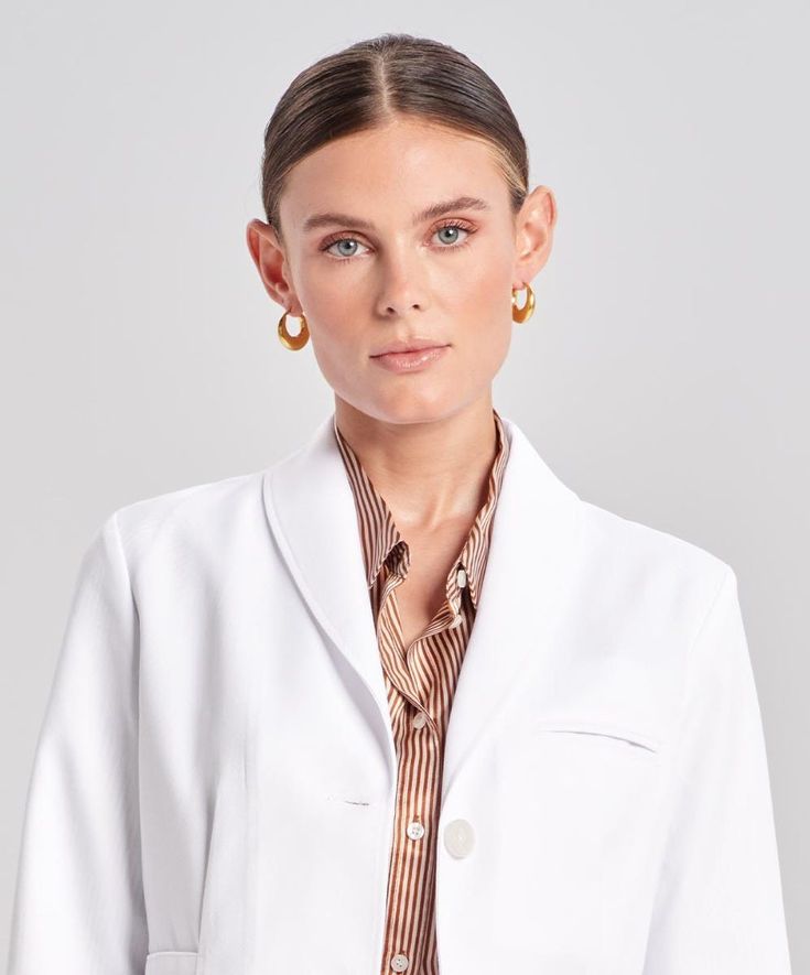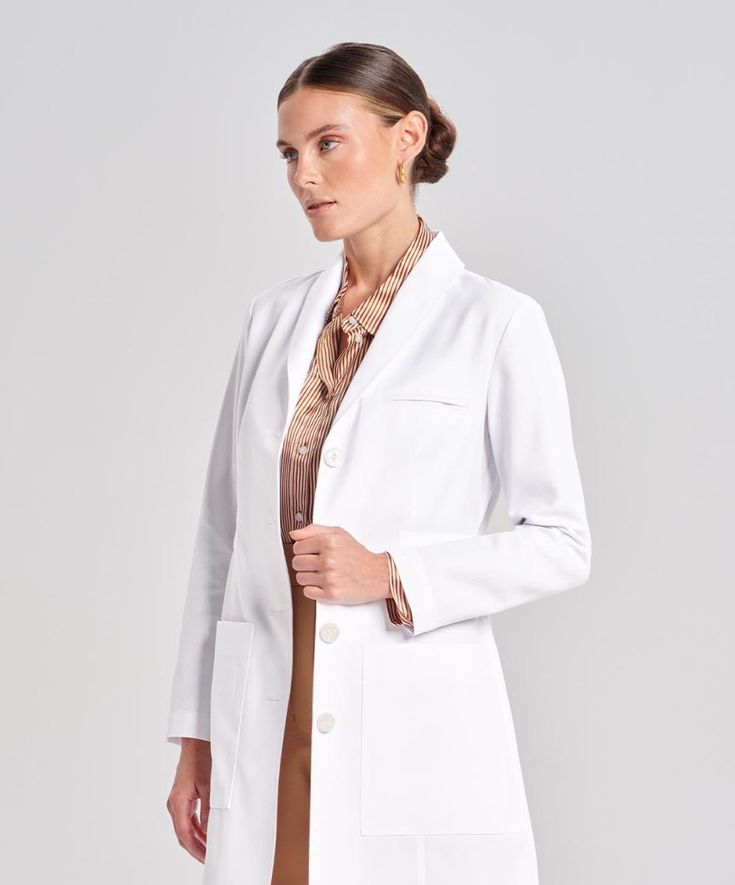 Mẫu áo blouse trắng tay ngắn/dài bác sỹ, dược sỹ, y tá với thiết kế cổ bẻ Danton theo phong cách đơn giản. Với màu trắng truyền thống của màu áo blouse cùng form dáng thoải mái dễ chịu trong suốt quá trình làm việc. Thiết kế đơn giản với áo khuy cài giữa, có diễu trước, tạo form dáng cho áo vừa vặn với từng dáng người. Phía hai bên áo là hai túi vuông, có túi ngực cài bút hoặc treo thẻ tên, xẻ tà sau. Một số mẫu thiết kế đai lưng phong cách