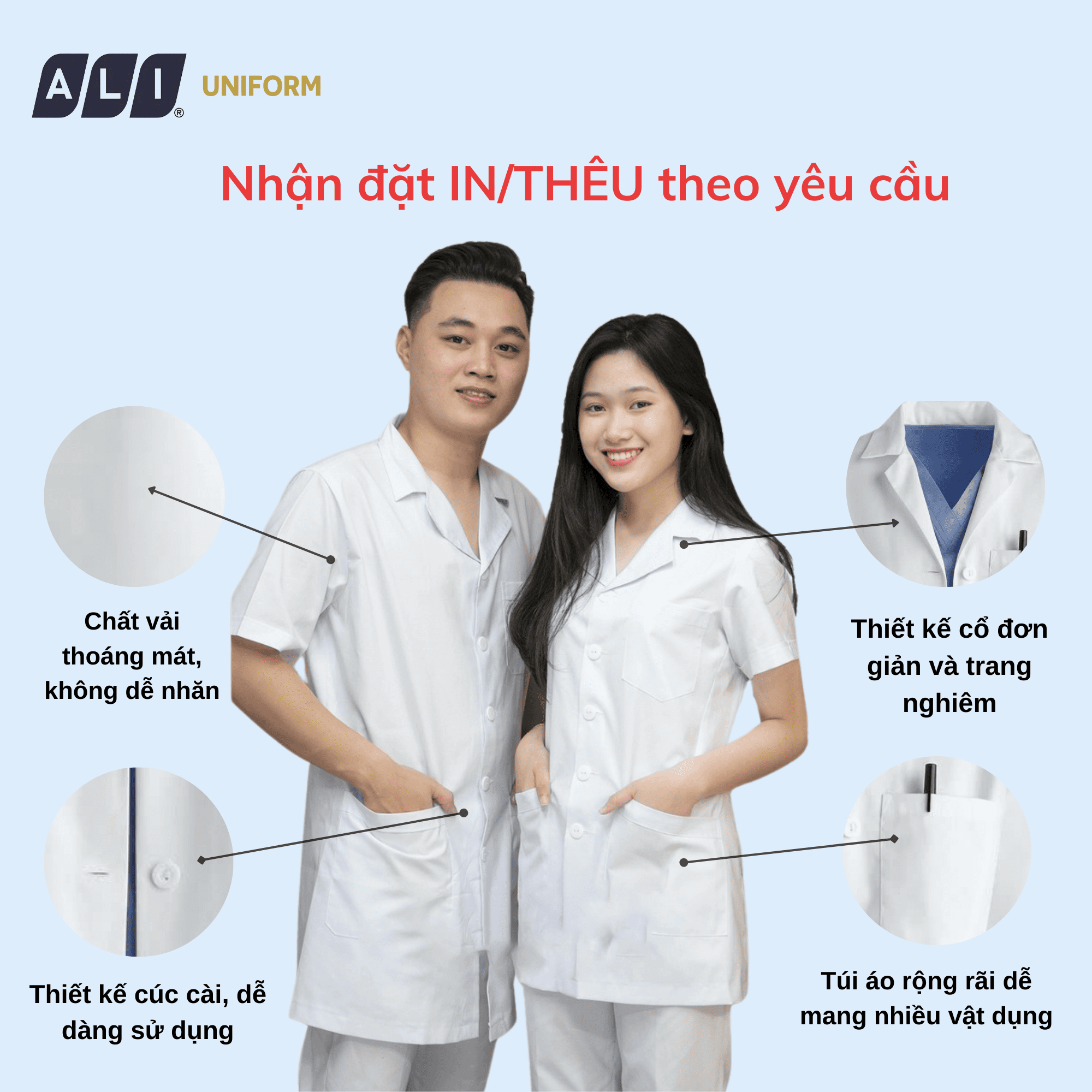 Bạn đang tìm kiếm một chiếc áo blouse, áo bác sĩ, đồng phục y tế vừa thoải mái, thoáng mát, vừa đảm bảo vệ sinh và chuyên nghiệp? Áo Blouse của Aligro chính là giải pháp hoàn hảo. Với chất liệu vải lon cao cấp, thiết kế thông minh và dịch vụ in thêu theo yêu cầu, chúng tôi cam kết mang đến sự hài lòng tuyệt đối cho khách hàng.