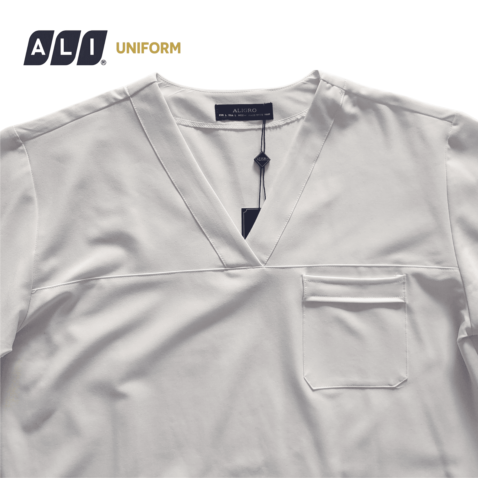 - Thiết kế: Cổ tim, áo có 2 túi sườn và có túi ngực cài thẻ tên, quần bo chun 2 cạnh sườn, ông suông