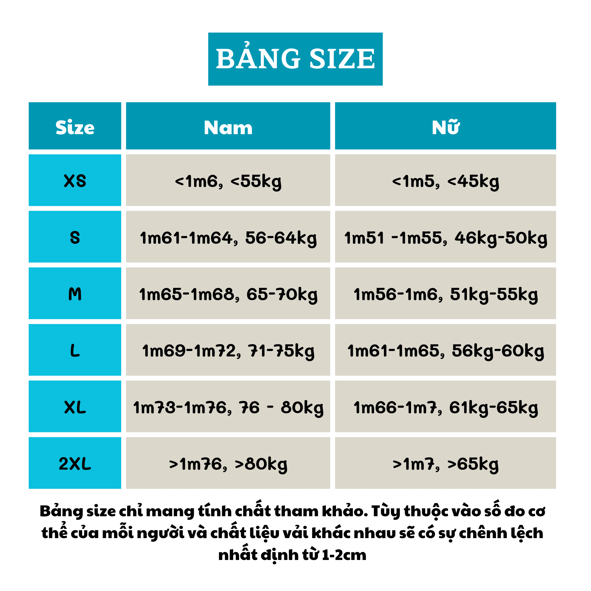 Lưu ý: Bảng size chỉ mang tính chất tham khảo. Tùy thuộc vào số đo cơ thể của mỗi người và chất liệu vải khác nhau sẽ có sự chênh lệch nhất định từ 1-2cm