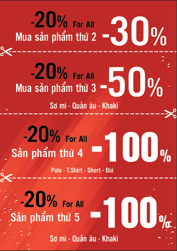 -Mua áo sơ mi, quần âu, quần kaki với khuyến mãi 20% sẽ được giảm giá 50% cho sản phẩm thứ 3