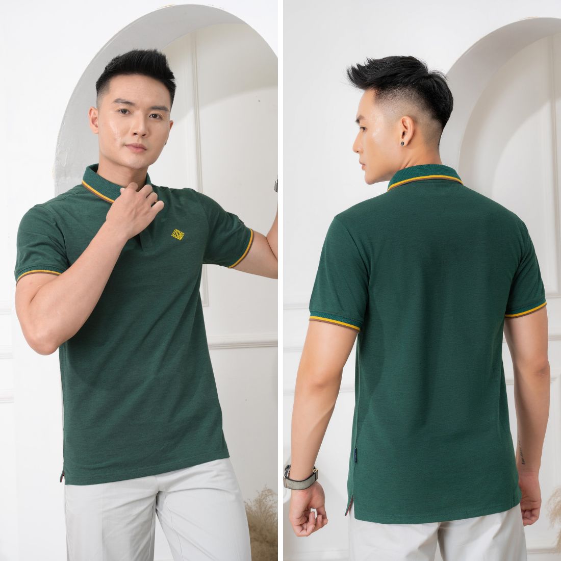- Áo polo xanh rêu + quần kaki nâu