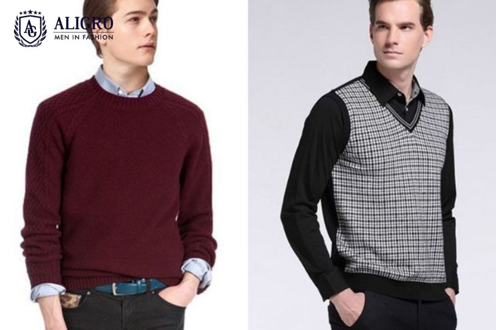 - Mặc áo len cổ tròn bên ngoài áo sơ mi